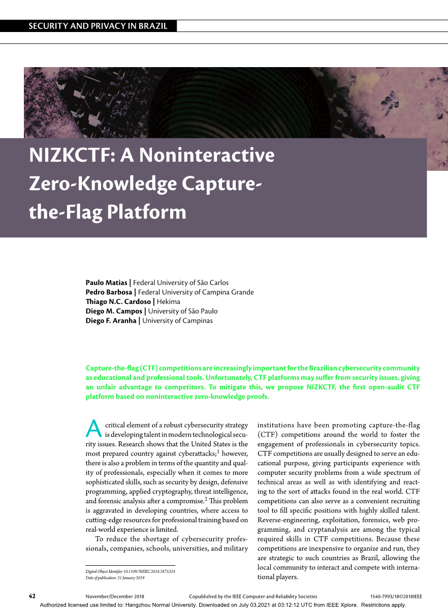 夺旗 (CTF) 比赛作为教育和专业工具对巴西网络安全社区越来越重要。不幸的是,CTF 平台可能会遇到安全问题,从而给竞争对手带来不公平的优势。为了缓解这种情况,我们提出了 NIZKCTF,这是第一个基于非交互式零知识证明的开放式审计 CTF 平台。