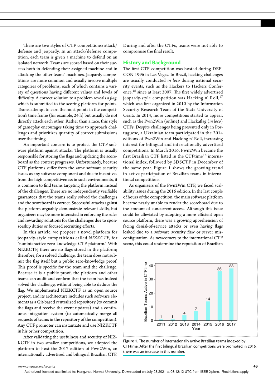1996 年在拉斯维加斯举行的 DEFCON 期间举办了第一届 CTF 比赛。在巴西,黑客挑战通常在国家安全活动期间在本地进行,例如从 2007年开始举办的 Hackers to Hackers Conference,16。第一个广泛宣传的解题式竞赛是 Hacking nRoll,17于 2010 年首次举办由塞阿拉州立大学信息安全研究小组提供。2014 年,更多的比赛开始出现,例如 Pwn2Win(在线)和 Hackaflag(本地 ) CTF。尽管挑战仅以葡萄牙语呈现,但一支乌克兰团队参加了 2014 年版的 Pwn2Win 和 Hacking n Roll,增加了对双语和国际比赛的兴趣。2016年3月,Pwn2Win成为首个入选CTFtime 18国际指数的巴西CTF ,同年12月DSCTF紧随其后。图1显示了巴西队积极参与国际比赛的趋势。
