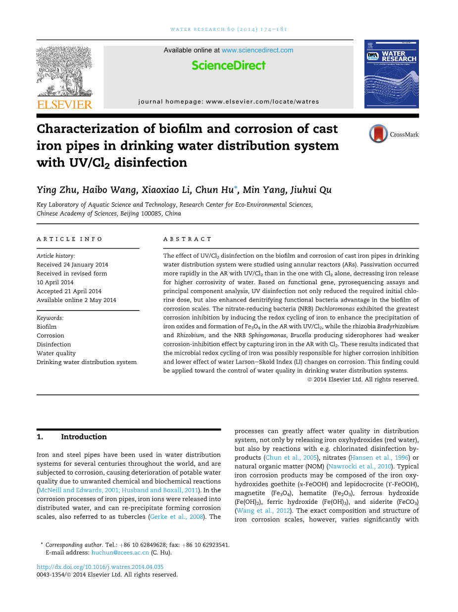 铸铁管在紫外/氯气消毒的饮用水系统中的腐蚀和生物膜特性