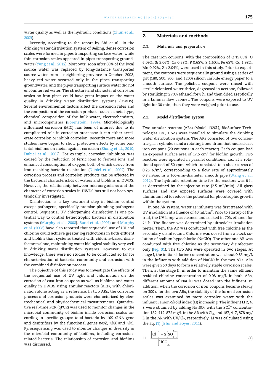 在一个环形反应器内,水的支流首先被紫外线以40mJ/cm2的强度照射。在启动试验之前,紫外线灯要进行清洗,在70%的乙醇内浸泡24h。对水流的影响通过紫外线辐射计测定。然后,用游离氯对环形反应器内的水流进行二次消毒。氯从次氯酸钠(次氯酸钠)的贮备溶液中给药。另一个环形反应器只用游离氯来进行二次消毒(图S1)。两个环形反应器分两个阶段操作。在第一阶段,通过在两个环形反应器中添加次氯酸钠得到初始氯,最后浓度大约0.85mg/L。50天后,环形反应器内形成相对稳定的腐蚀。然后,在第二阶段,为了保证两个环形反应器内的出水余氯的浓度为0.08 mg / L,将不同质量的NaClO投入到支流中。此外,两个环形反应器内铸铁管的腐蚀在300天的时候达到稳定,形成的腐蚀的稳定性由大量腐蚀性水来测定,所用水的量也伴随着Larson-Skold指数的增加而增加。通过添加硫酸钠,利用硫酸根离子使Larson-Skold指数集中在2,4,8,氯气反应器中硫酸根离子的含量在182,412,872mg/L,紫外/氯气反应器中硫酸根离子的含量在187,417,878mg/L。LI通过以下式子计算: