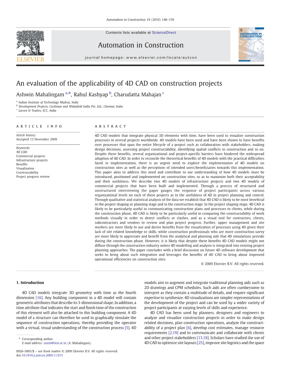 4D CAD models that integrate physical 3D elements with time, have been used to visualize construction processes in several projects worldwide. 4D models have been used and have been shown to have benefits over processes that span the entire life-cycle of a project such as collaboration with stakeholders, making design decisions, assessing project construct ability, identifying spatial conflicts in construction and so on. Despite these benefits, several organizational and project-specific barriers have hindered the widespread adoption of 4D CAD. there is an urgent need to In order to reconcile the theoretical benefits of 4D models with the practical difficulties faced in implementation, explore the implementation of 4D models on construction sites as well as the perceptions of intended users/beneficiaries towards this implementation. This paper aims to address this need and contribute to our understanding of how 4D models must be introduced, positioned and implemented on construction sites, so as to maximize both their acceptability and their usefulness. We describe two 4D models of infrastructure projects and two 4D models of commercial projects that have been built and implemented. Through a process of structured and unstructured interviewing the paper gauges the response of project participants across various organizational levels on each of these projects as to the usefulness of 4D in project planning and control. Through qualitative and statistical analysis of the data we establish that 4D CAD is likely to be most beneficial in the project shaping or planning stage and in the construction stage. In the project shaping stage, 4D CAD is likely to be particularly useful in communicating construction plans and processes to clients, while during the construction phase, 4D CAD is likely to be particularly useful in comparing the construct ability of work methods visually in order to detect conflicts or clashes, and as a visual tool for contractors, clients, subcontractors and vendors to review and plan project progress. Further, upper management and site workers are more likely to use and derive benefits from the visualization of processes using 4D given their lack of site related knowledge or skills, while construction professionals who are more construction-savvy are more likely to appreciate and benefit from the analytic and planning aids that 4D simulations provide during the construction phase. However, it is likely that despite these benefits 4D CAD models might not diffuse through the construction industry unless 4D modeling and analysis is integrated into existing project planning approaches. The paper concludes with a brief discussion on future 4D software development that seeks to bring about such integration and leverages the benefits of 4D CAD to bring about improved operational efficiency on construction sites.