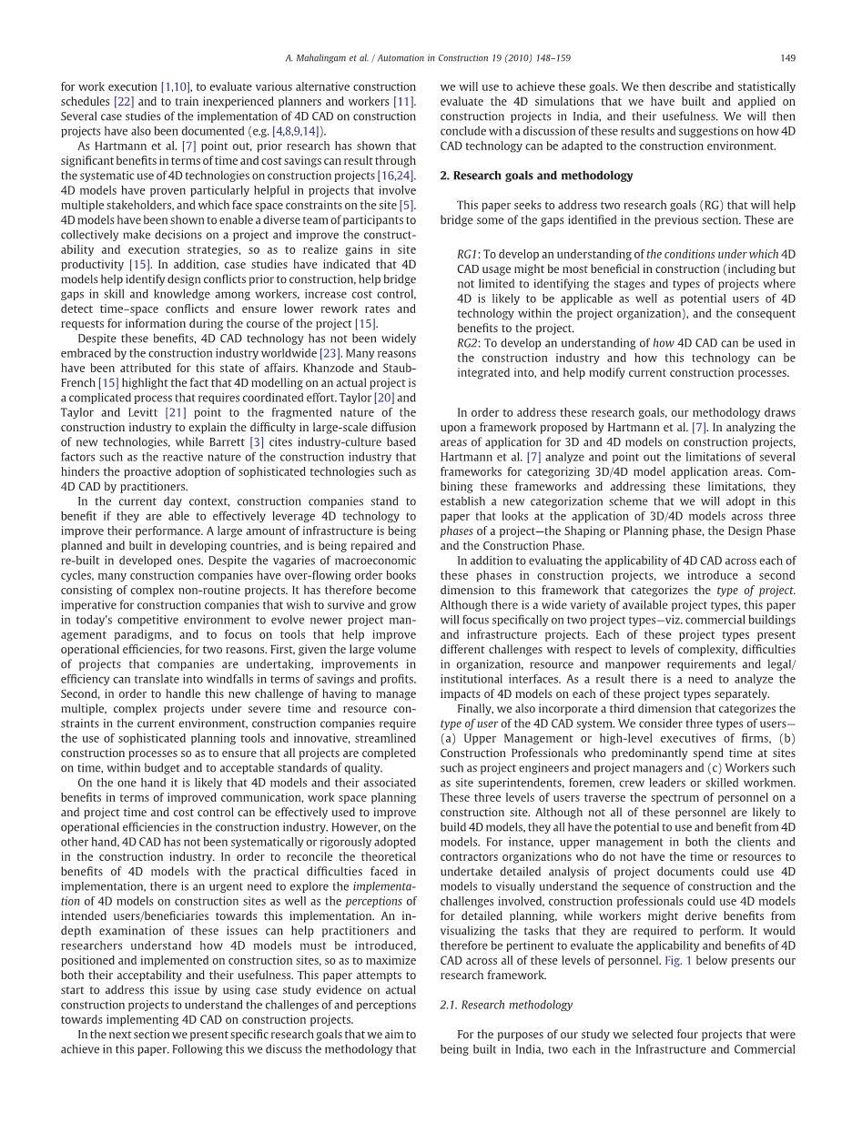 4D CAD models integrate 3D geometry with time as the fourth dimension [16]. Any building component in a 4D model will contain geometric attributes that describe its 3-dimensional shape. In addition, a time attribute that indicates the start and finish time of the construction of this element will also be attached to this building component. A 4D model of a structure can therefore be used to graphically simulate the sequence of construction operations, thereby providing the operator with a virtual, visual understanding of the construction process [5]. 4D models aim to augment and integrate traditional planning aids such as 2D drawings and CPM schedules. Such aids are often cumbersome to interpret as they contain a multitude of details, and require significant expertise to synthesize. 4D visualizations are simpler representations of the development of the project and can be used by a wider variety of project participants at varying levels of skills and experience.4D CAD has been used by planners, designers and engineers to analyze and visualize construction projects in order to make design related decisions, plan construction operations, analyze the construct-ability of a project plan [6], develop cost estimates, manage resource requirements [2,19] and to communicate and collaborate with clients and other project stakeholders [13,18]. Scholars have studied the use of 4D CAD to optimize site layouts [2