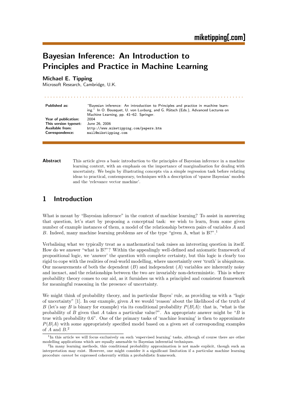 摘要:在机器学习背景下,对贝叶斯推理的原理进行基本介绍,并强调用于处理不确定性的边缘化的重要性。在正文部分,首先建立简单回归模型并论述本文观点,然后通过描述稀疏贝叶斯模型和“关联向量机”将这些观点和现实技术相联系。