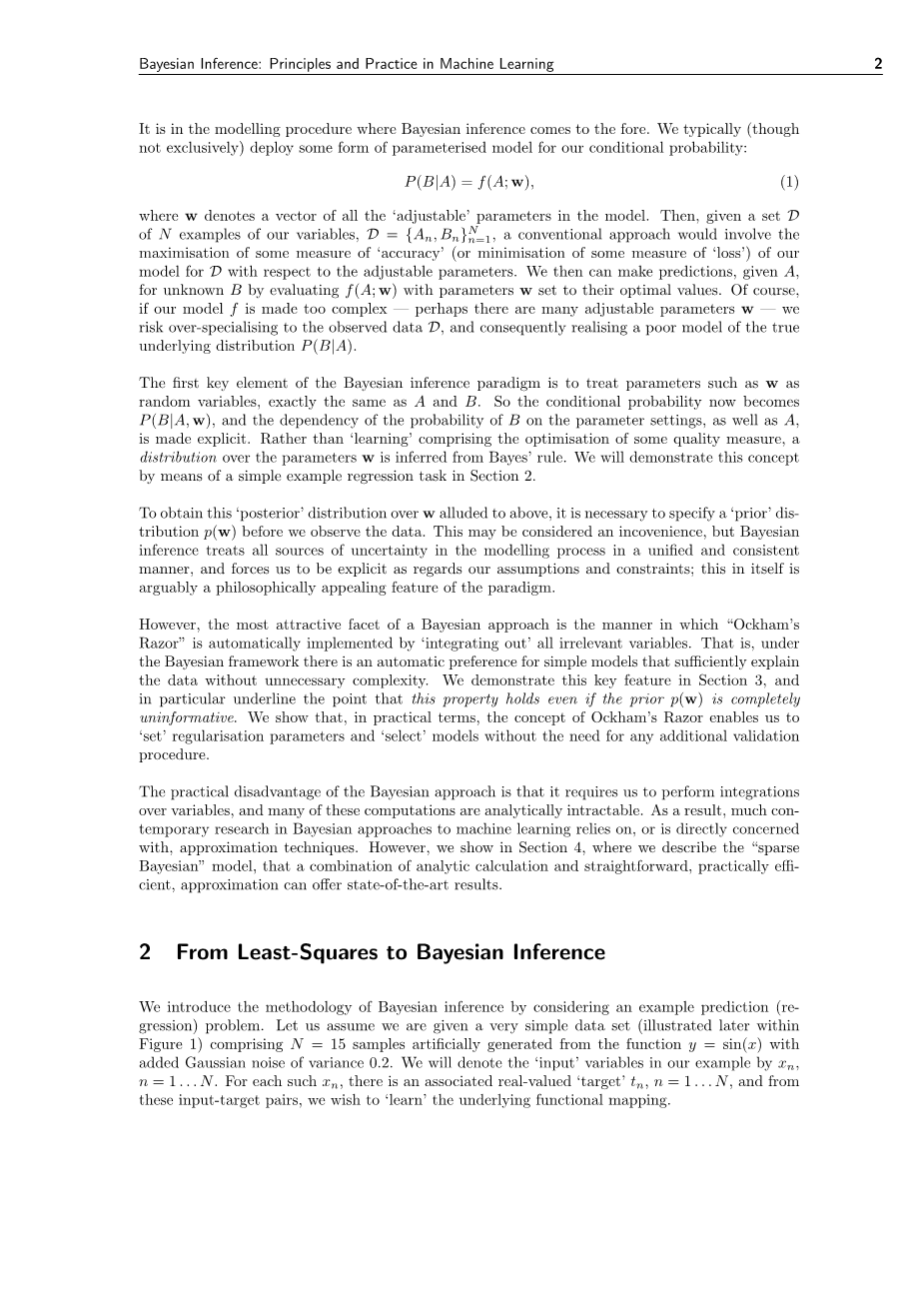 p(w)。尽管这是一个繁琐的事情,不过贝叶斯推理以统一和一致的方式对待建模过程中所有的不确定输入,并对假设条件和约束条件进行明确,这些都是范式本身具有的极好的特征。