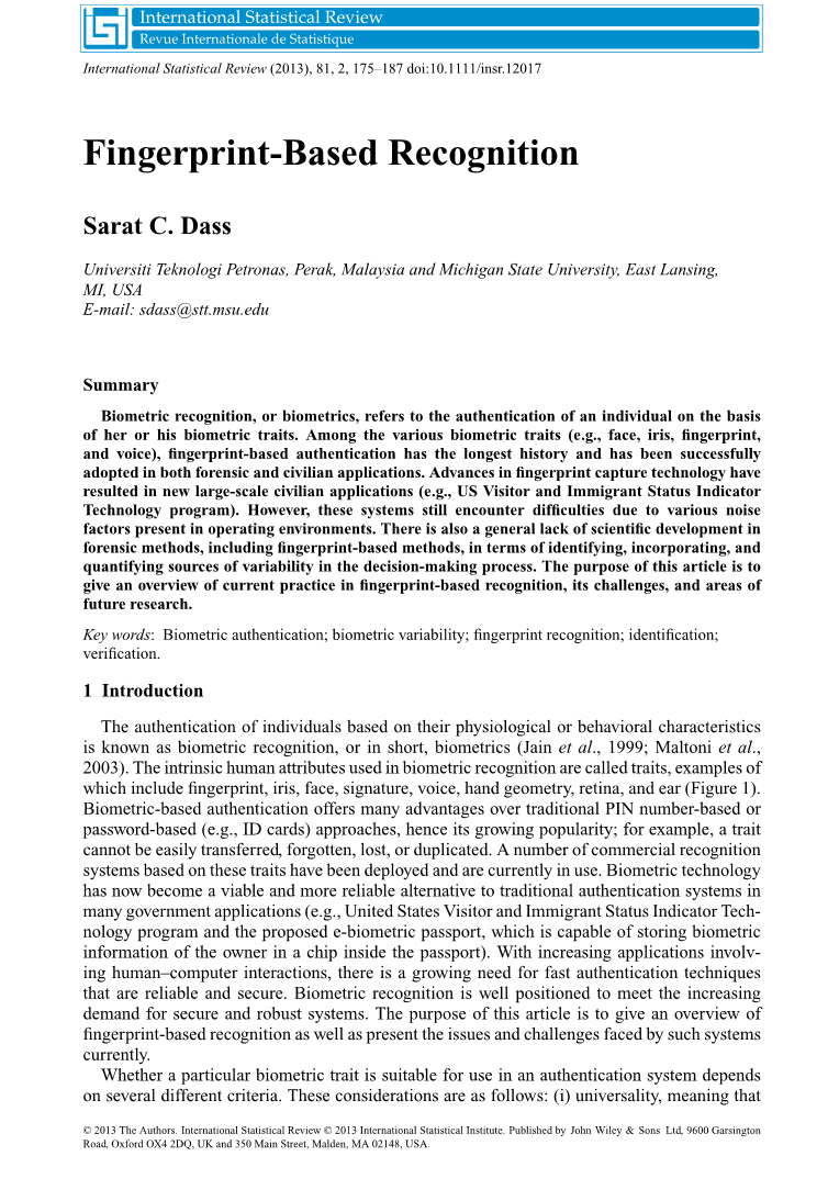 生物特征识别、生物识别技术是指以她或他的生物特征为基础来进行个人的身份验证的。在各种生物特征(例如脸、虹膜、指纹和语音),基于指纹的身份验证有最悠久的历史而且已经成功在取证和民用中采用。指纹采集技术的进步导致了新的大规模民用应用程序(如美国游客和移民身份指示技术方案)。然而,由于出现在操作环境中各种噪声因素,这些系统仍然遇到许多困难。还有一个是在取证方法上普遍缺乏科学发展,包括基于指纹的方法,识别、合并、量化决策过程的可变性来源来的方面。本文的目的是概述当前基于指纹识别的实践,它的挑战和未来的研究领域。