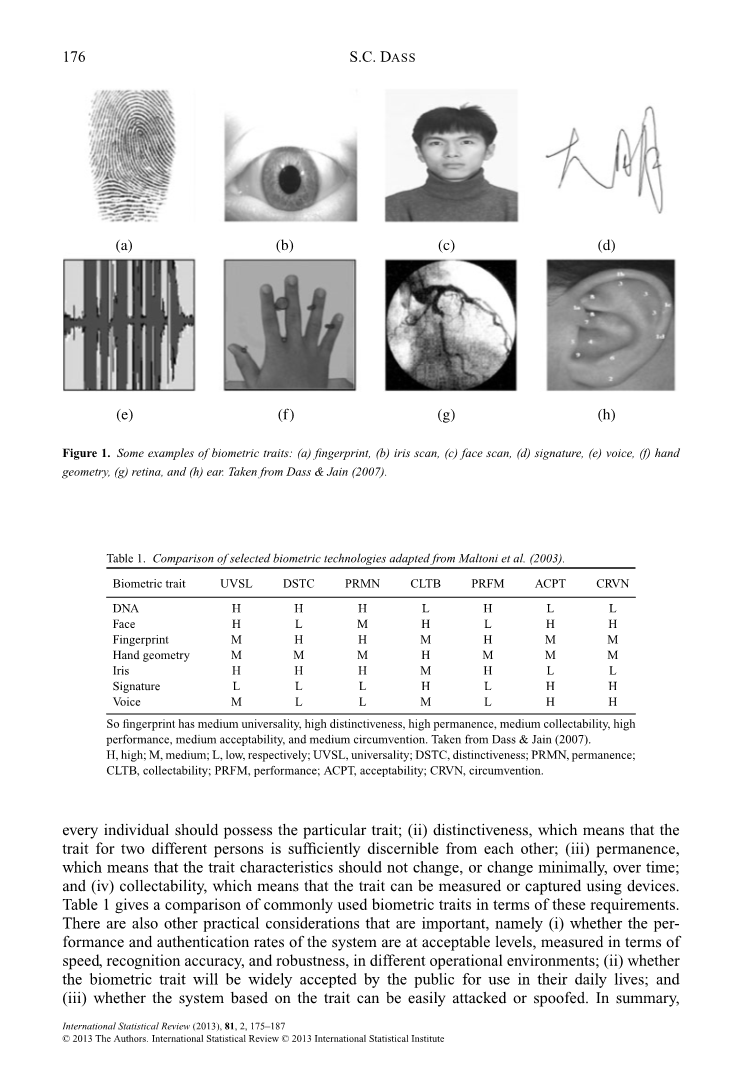 表1.比较选择的生物识别技术--采用Maltoni等人(2003)