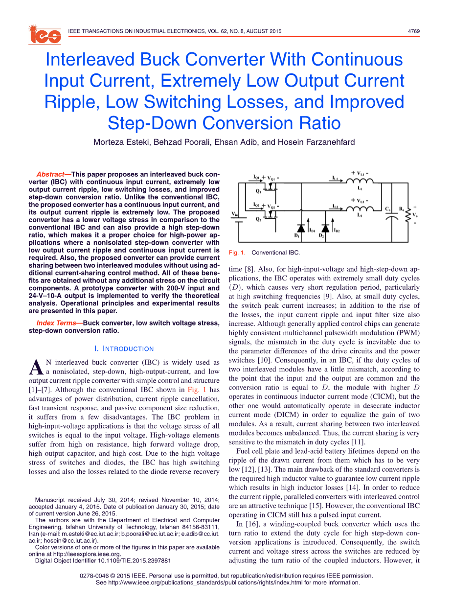 本文介绍了一种适用于输入电压的新IBC的拓扑结构,它有高压降和低输出电流与连续输入电流的非隔离应用程序。在稳定状态下,开关的电压应力低于输入电压,因此开关和电容导通损耗降低。续流二极管的电压应力也低于传统的IBC,所以快速肖特基二极管可以用以降低反向恢复问题。转换器的转换率低于传统的IBC;因此,开关工作周期可以延长,降低峰值电流。即使使用一个非常小的电感器,转换器的输出电流纹波也是相当低的。不同于其他产品,该变换器的输入电流是脉动。建议的转换器也不需要任何额外的电流共享控制模块。所提出的转换器几乎抑制了模块的占空比的不匹配的影响。