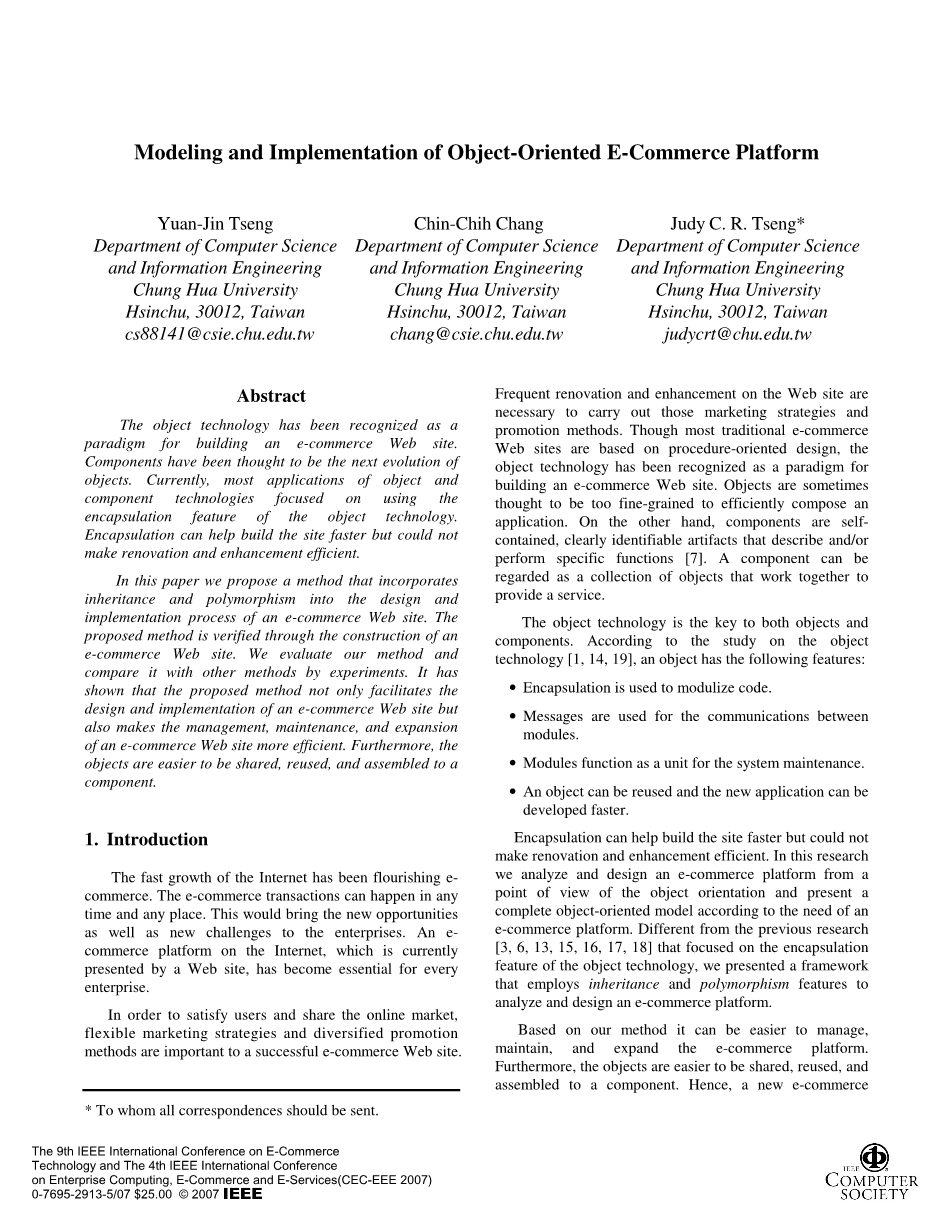 封装可以帮助更快地建立网站,但不能改造和提高效率。在本研究,我们从面向对象的观点分析和设计电子商务平台,以及根据电子商务平台的需要,呈现了一个完整的面向对象的模型。不同于之前聚焦于对象技术的封装特性的研究,,我们提出了一个框架,使用继承和多态特性分析和设计一个电子商务平台。