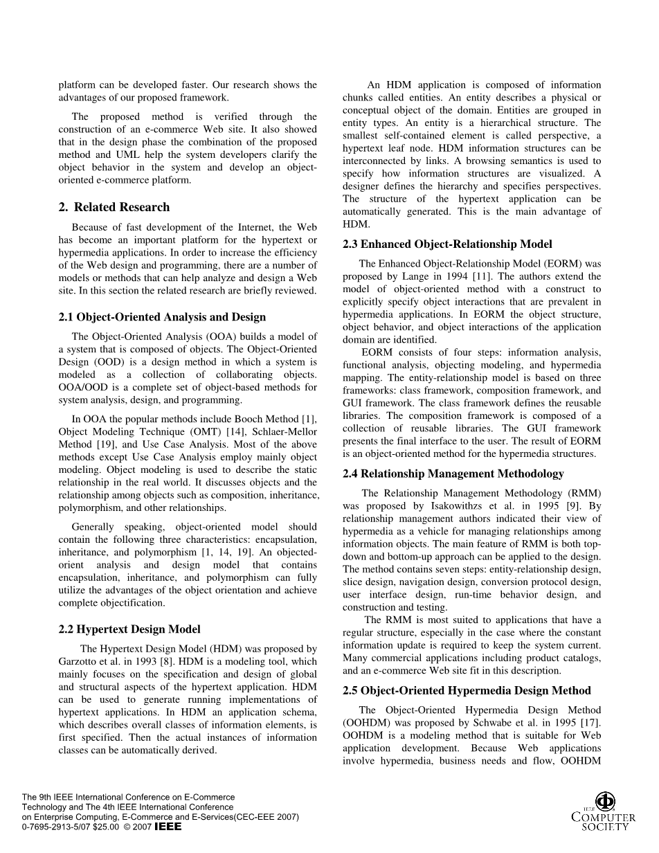一些超媒体的比较方法可以在[12]中发现。我们注意到上述方法主要采用对象技术的封装特点,继承和多态不提及。因为OOHDM是针对超媒体,该方法通过如前所述的多种方式来扩展,以满足快速增长的电子商务应用程序的各种各样的需求。在本研究中,我们提出一个方法,将继承和多态性结合到OOHDM中去。从这个研究我们了解继承和多态性可以帮助应对快速变化的电子商务网站的需求,通过之前提到的方法,对象更容易共享、重用和组装组件。