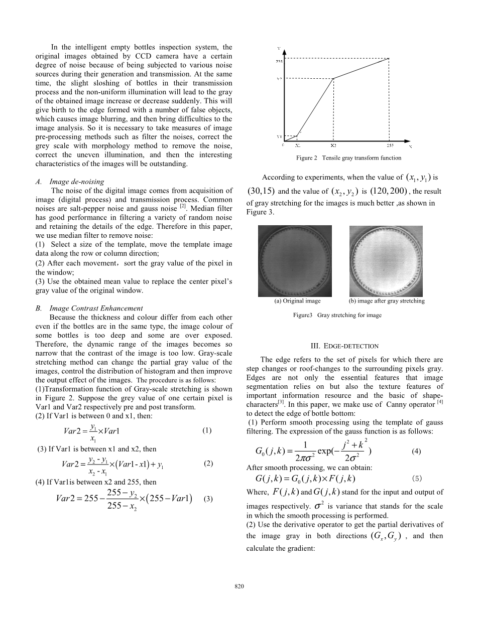 由于厚度和颜色不同,即使在同一类型的瓶子,一些瓶的图像颜色太深,有些是过度暴露。因此,动态范围的图像变得如此狭窄,图像的对比度太低。灰度 stretching method can change the partial gray value of the images, control the distribution of histogram and then improve the output effect of the images. The procedure is as follows:拉伸法可以改变图像的部分灰度值,控制直方图的分布,进而提高图像的输出效果。该程序如下: