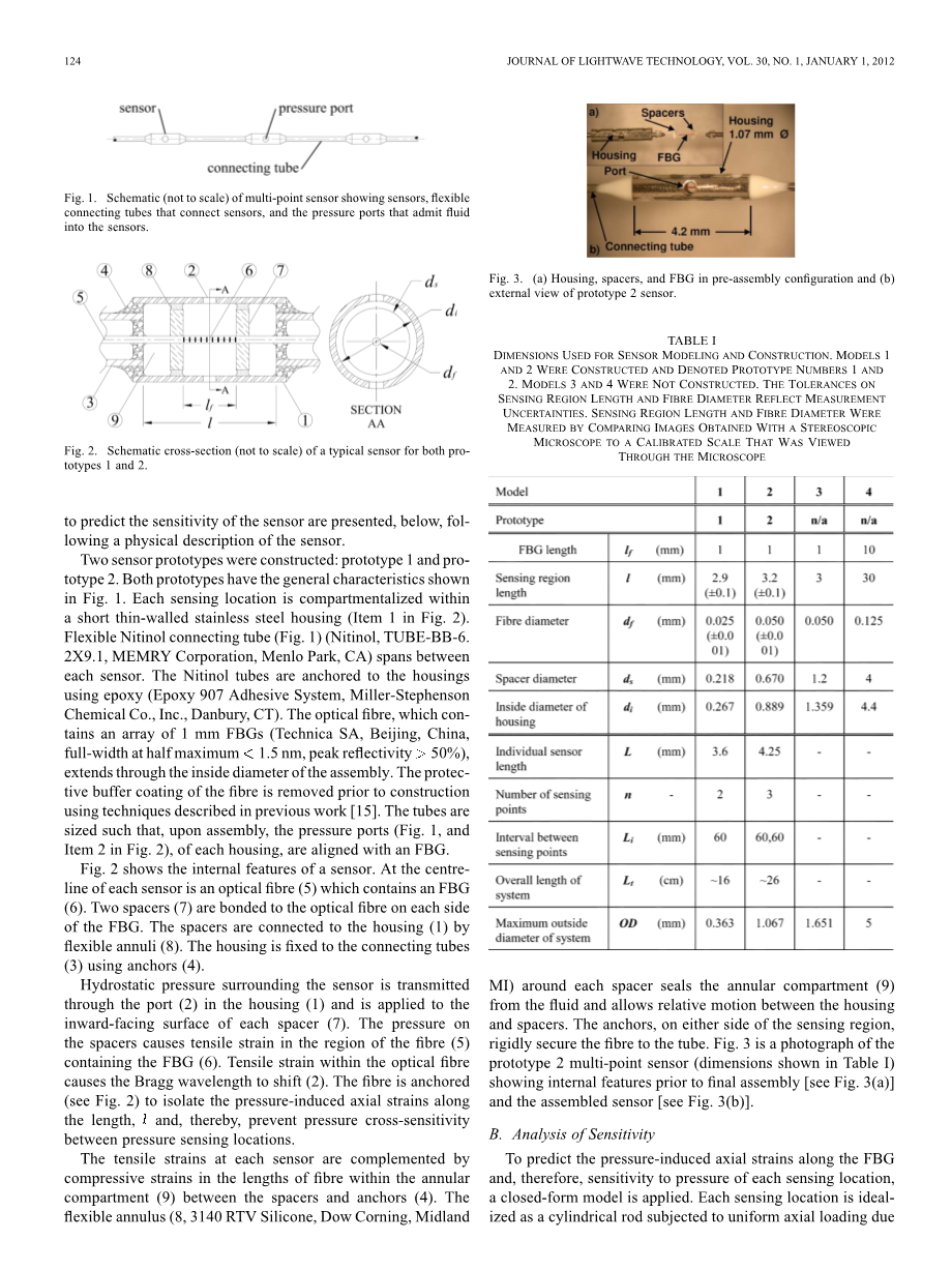 两个传感器原型被相互连接着,分为:原型1和原型2。所有的原型都具有和Fig.1中相同的特征。每一个传感器单元都被短小细的不锈钢外壳包裹。柔性钛合金导管连接着每一个传感器。钛合金通道使用环氧基树脂外壳固定。光纤包括一组1毫米布拉格光栅单元(中国北京泰克里科光学公司,反射率峰值gt;50%)延伸通过管道内径进行装配。在组建技术验证平台之前的工作中去掉保护光纤纤维的缓冲层。通道尺寸,压力端口装配均如Fig.1和Fig.2中项目2所示。每一个外罩均对准一个布拉格光栅单元。Fig.2展示了传感器的内部构造。每一个传感器的中心线是一道光纤(项目5)包含光纤光栅(项目6)。两个垫片被用于结合光纤。它们通过柔性圆环(项目8)与外壳(项目1)相连,外壳使用连接点(项目4)固定于管道是(项目3)上。