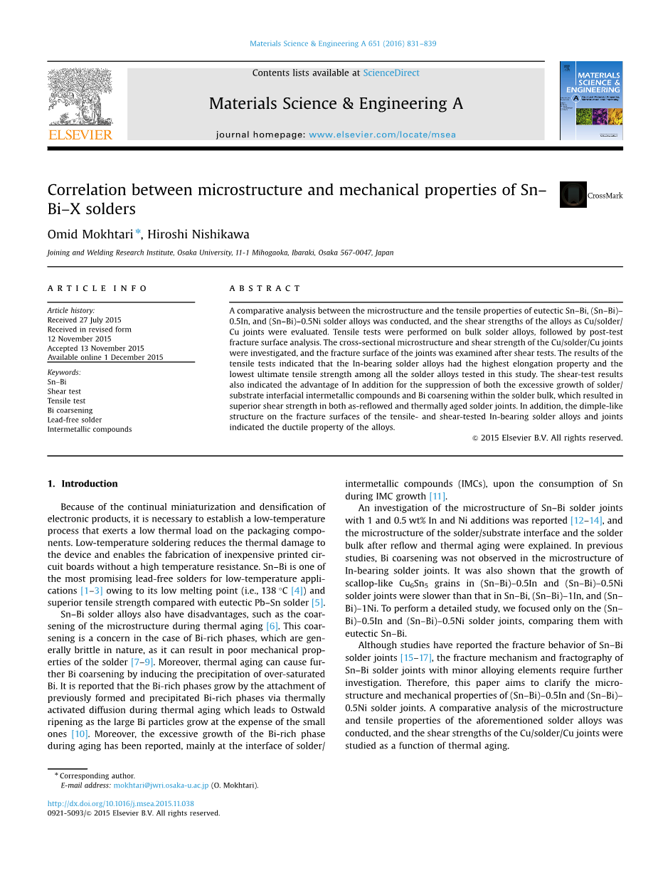 由于电子产品的不断小型化和致密化,有必要建立一个低温的过程,用低的热负荷来包装组件。低温焊接降低了装置的热损伤,使廉价的印刷电路板的制作没有很高的耐热性。Sn-Bi是一种最有前途的无铅焊料的低温应用[1-3]由于与共晶Pb-Sn焊料的铅[5]比较,其熔点低(即,138℃[4])和优异的拉伸强度。