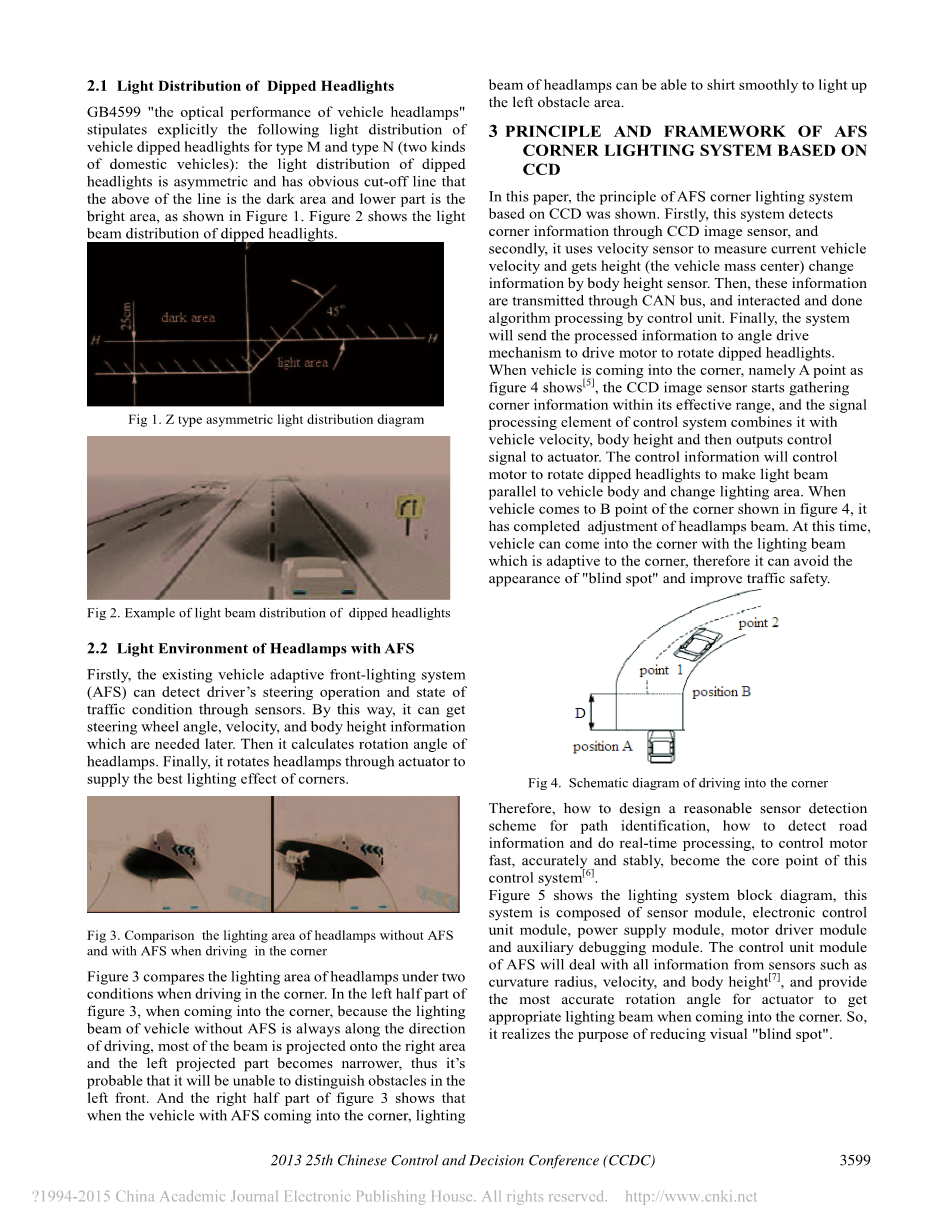 本文证明了基于CCD的AFS角落照明系统的原理。首先,该系统通过CCD图像传感器检测到的角点信息,其次,它采用速度传感器测量确定当前车辆速度,并通过车身高度传感器获取高度(车辆质心)变化信息。然后,这些信息通过CAN总线,并相互作用,完成算法算法处理控制单元。最后,将处理后的信息发送到角驱动机构,驱动电机旋转下降的前照灯。当车辆进入拐角,钠这位母亲一点如图4所示,CCD图像传感器,其有效范围内开始角信息收集及控制系统的信号处理单元,结合车辆速度低速,身高,然后输出控制信号,执行器。控制信息将控制电机旋转,使光线平行于车身和改变照明意。当车来到如图4所示的角点,完成了前大灯光束调整。在这个时候,汽车可以与照明光束,我在角落里因此,它可以避免出现“盲点”,提高交通安全。