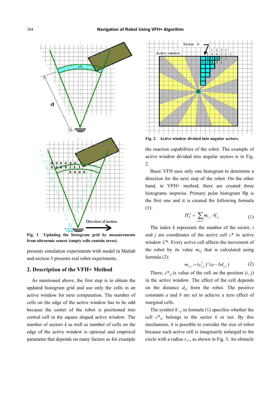 如上文所述,第一步是获取更新直方图网格和使用中的单元格下一次计算的的活动窗口。数目在活动窗口的边缘细胞已让人觉得奇怪因为机器人的中心定位在广场的中央细胞形活动窗口。数字的部门 k 上的单元格数目活动窗口的边缘是可选的实证参数,取决于许多因素,例如图 2 活动窗口分为角的部门。反应能力的机器人。示例活动窗口分为角部门是无花果。基本的 VFH 使用只有一个直方图来确定下一步的机器人的方向。另一方面手,VFH 方法,那里创建三个逐步的直方图。Hp 是初级极地直方图第一,它被创建下面的公式