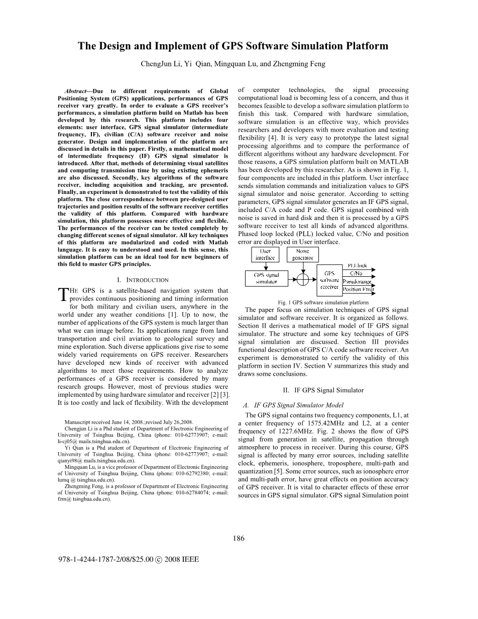 GPS卫星定位系统在全世界各个地方任何天气下为军事用户和民间用户提供持续的定位和时间信息。到目前为止,GPS系统的应用数量远比我们之前想象 的多。其应用范围从陆路运输、民航到矿山勘探的地质调查。这么多的应用使GPS接收器有广泛多样的需求。研究人员已经开发出新型先进的接收机算法来满足这些需求。许多的搜寻组织正在考虑如何去分析GPS接收器的表现。然而,以往的研究大多是采用硬件仿真器和接收器实现,花费高且缺乏灵活性。随着电脑技术的发展,信号处理和计算负载正变得越来越少关注,因此开发一个软件仿真平台来解决这个工作时可行的。相比于硬件仿真,软件仿真是一个有效的途径,它为研究员和开发人员提供更多评估和测试的灵活性.建立最新信号处理算法并将它与没有硬件发展时不同算法的表现进行比较是很容易的。出于这些原因,一个GPS模拟器平台被这些研究人员在MATLAB的基础上建立起来。如Fig.1所示,这个平台包括四个部分,用户界面向全球定位系统信号模拟器和噪声发生器发送模拟命令和初始化值。根据设置参数,GPS信号模拟器产生一个IF GPS信号,包括C/A信号和P信号。GPS信号和噪声结合后保存在硬盘中,然后由一个GPS软件接收机对各种先进算法进行测试。锁相环锁定值,位置误差在用户界面中显示。