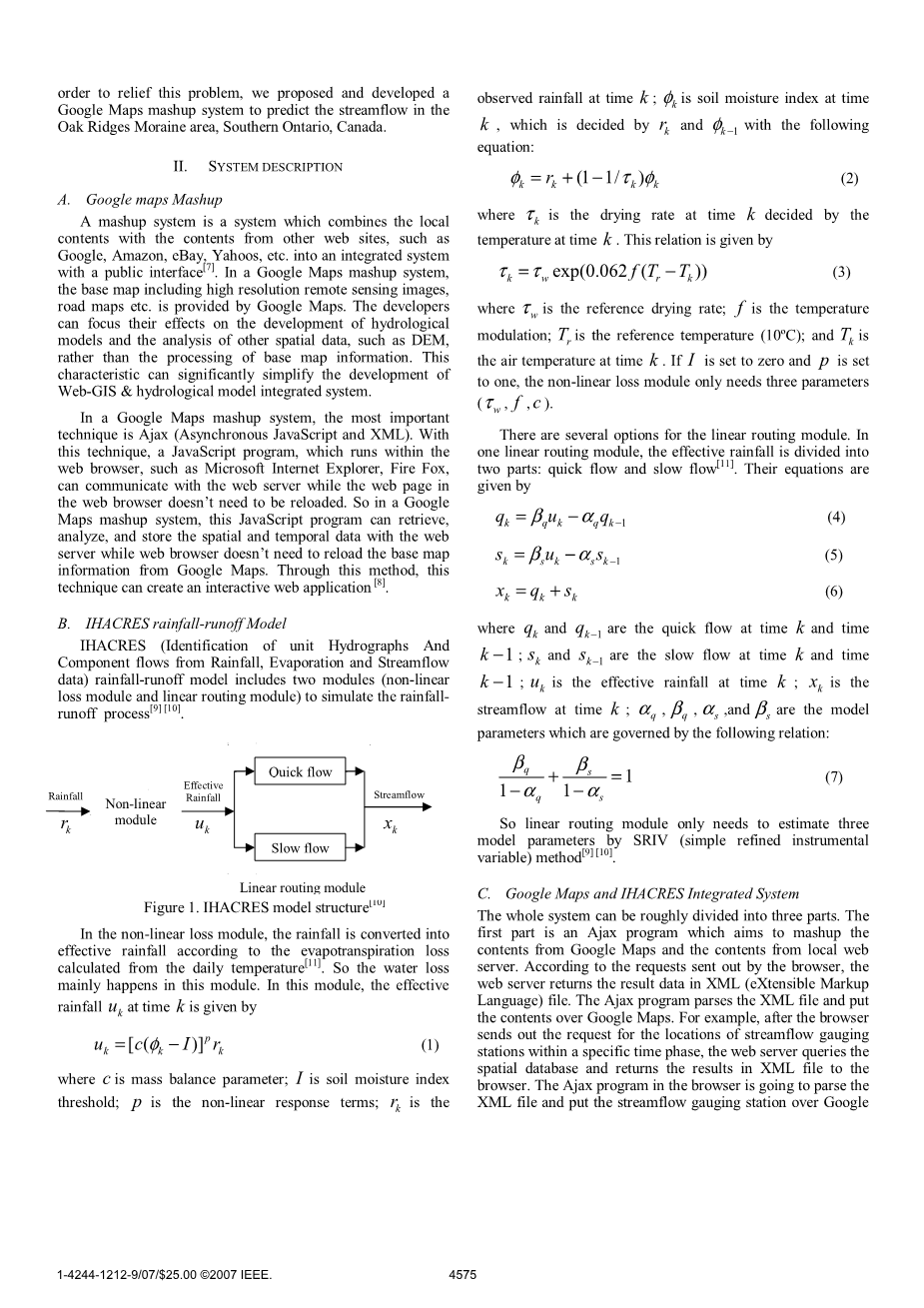 本文的目的是检查有关GIS(地理信息系统)和水文模式之间的集成的研究现状并提出系统与谷歌地图和IHACRES(单位线的识别和组件降雨,蒸发与径流数据流)模型之间的集成来预测加拿大安大略省南部橡树岭冰碛区的径流。与其他集成系统相比,本系统具有几个优点。首先,该系统是基于独立于平台的,并且不需要昂贵的地理信息系统软件的安装,用户只需要通过Web浏览器就可以访问整个系统。其次,与集成在Web-GIS中的系统,如ESRI 、ArcIMS的相比,本系统具有另一个优点。由于谷歌地图可提供重要的空间信息,包括高清晰度的图像,路网等,开发人员只需要处理一部分的空间数据,如流域边界,流网络和时间数据等。这个特性可以显著降低开发成本和时间。最后,不像其他集成系统,该系统只需要非常有限的GIS和水文知识以及基于人们熟知的的谷歌地图用户界面。这种优势显著地消除了公众想要访问此集成系统的障碍。