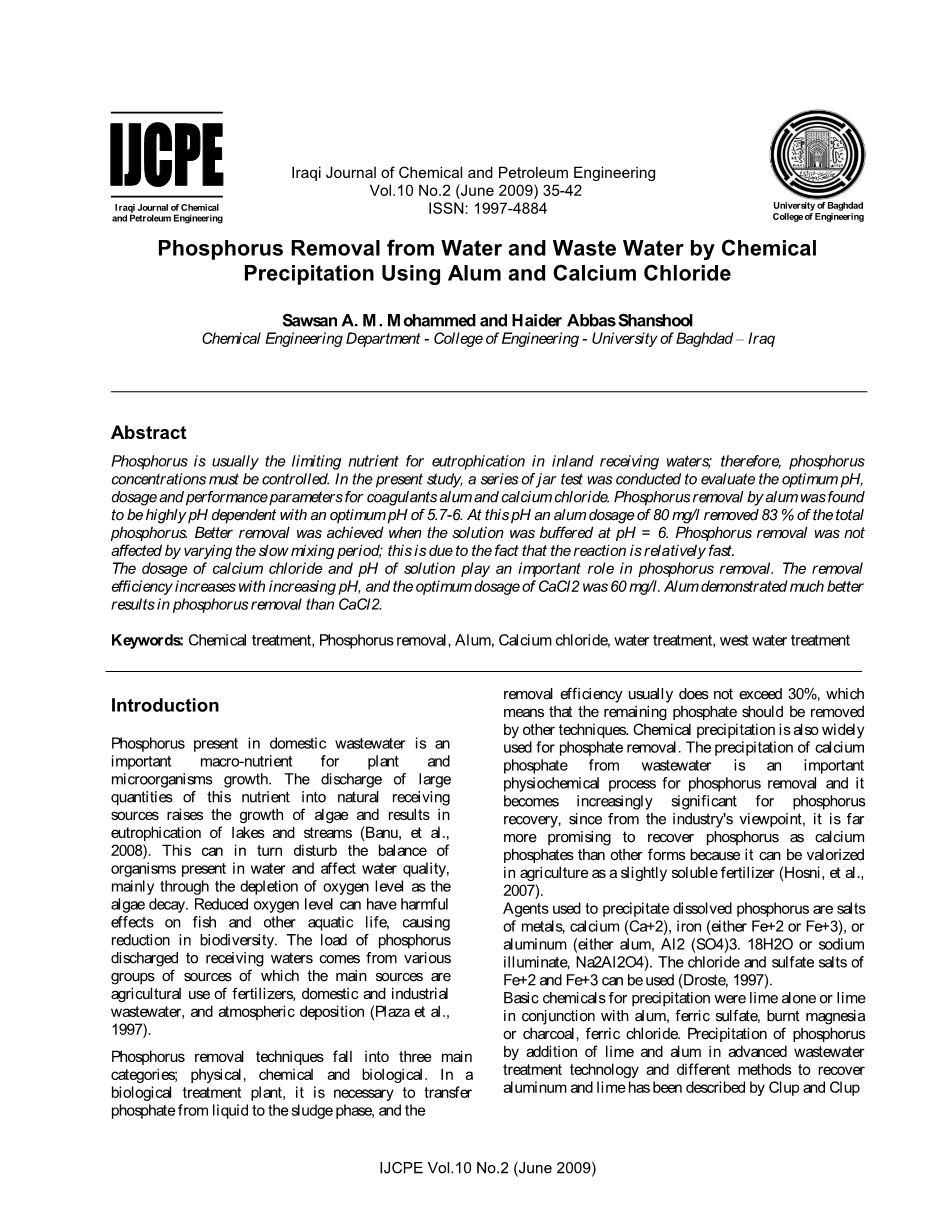 本研究的目的是研究由氯化钙和明矾从水溶液中除磷的可行性。考察了不同pH值、投加量、性能参数等。
