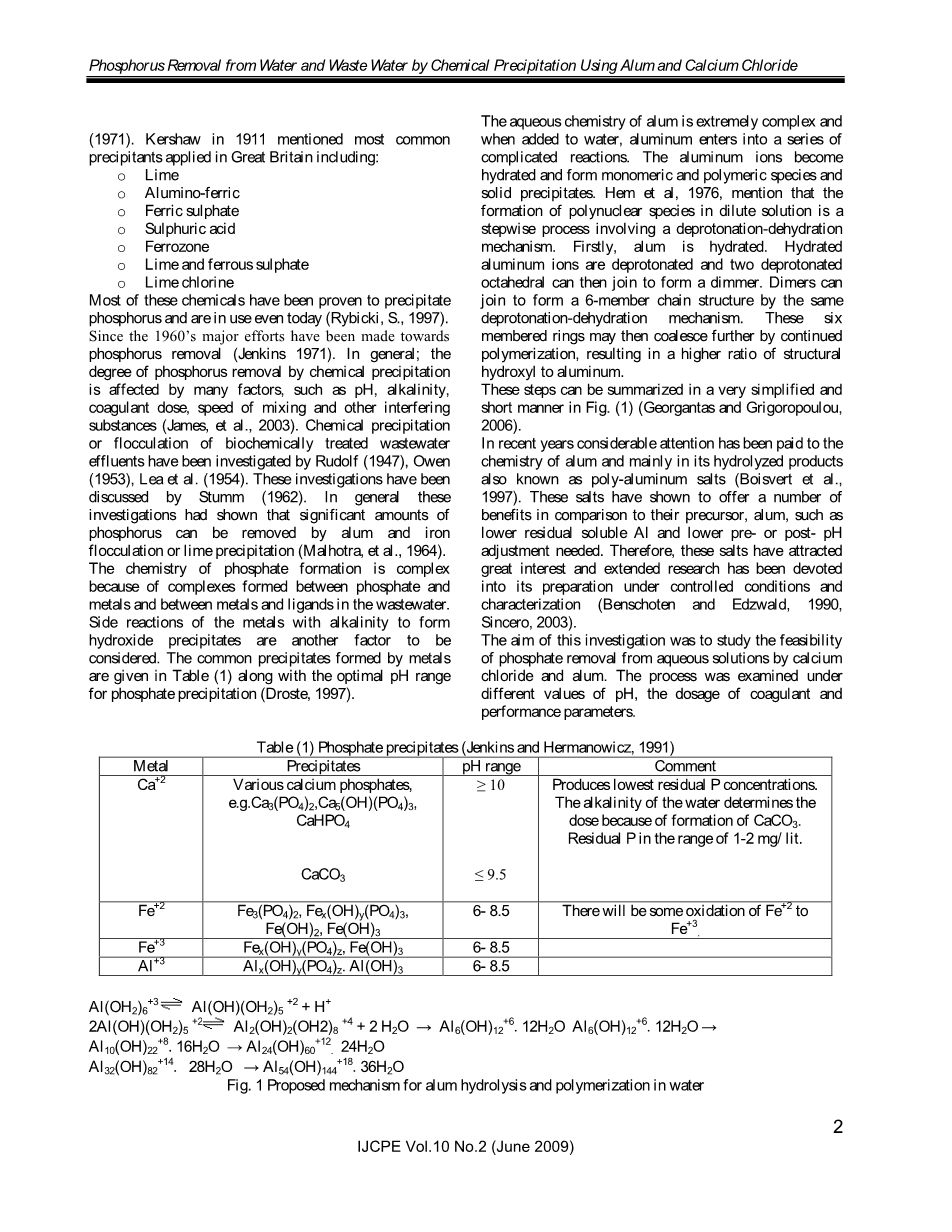 大多数这些化学物质已被证明可以沉淀磷,并且至今都在使用(雷比茨基,1997)。自从1960年以来,对除磷研究已经做出了主要的成果(詹金斯1971)。一般来说;利用化学沉淀的除磷程度取决于许多因素,如pH,碱度,凝结剂剂量,混合的速度和其他干扰物质的影响(詹姆斯,等人,2003)。化学沉淀法或生化处理废水的絮凝研究已经被Rudolf(1947),欧文(1953),Lea(1954)等人的研究过。这些研究已经被斯塔姆(1962)讨论过。一般来说,这些调查表明,大量的磷可以通过明矾和铁絮凝或石灰沉淀去除(马尔霍特拉,等人,1964)。磷酸盐形成的化学反应是复杂的,磷酸盐形成的化学物是在磷酸盐和金属之间以及废水中的金属和配体之间形成。金属在碱性条件下形成氢氧化物沉淀的副反应是另一个考虑因素。由金属形成的常见的沉淀物以及磷酸盐沉淀的最佳pH值范围已在在表(1)给出(德罗斯特,1997)。