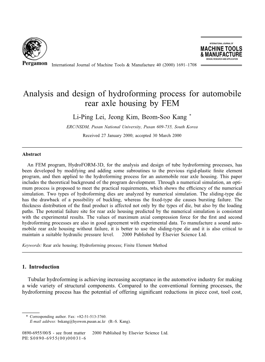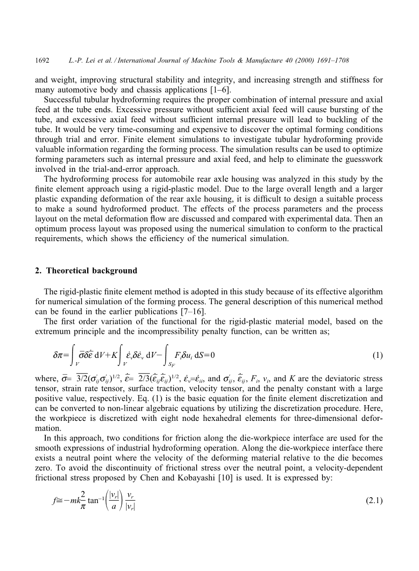 一个有限元程序,液压成型-3D,为了内高压成形过程的分析和设计,通过修改和增加了一些子程序以前刚塑性有限元程序得到了开发,然后应用到汽车后桥壳的液压成形工艺。 这篇论文包括程序开发的理论背景。通过数值模拟,提出一种可以满足实际要求的最佳工艺,展示了数值模拟的效率。两种类型的液压成形模具是通过数值模拟分析的。滑动式模具有的屈曲可能性的缺点,而固定式模具有可能导致破裂故障。最终产品的厚度分布不仅受模具类型的影响,同时也受到加载路径的影响。后桥壳数值模拟预测中潜在的故障点与实验结果是一致的,第一种和第二种液压成型工艺的最大轴向压缩力值也和实验数据一致。为了制造一个健全无故障的汽车后桥壳,最好是使用滑动式模具,关键是它还可以保持一个合适的液压水平。copy;Elsevier科学有限公司2000年出版。