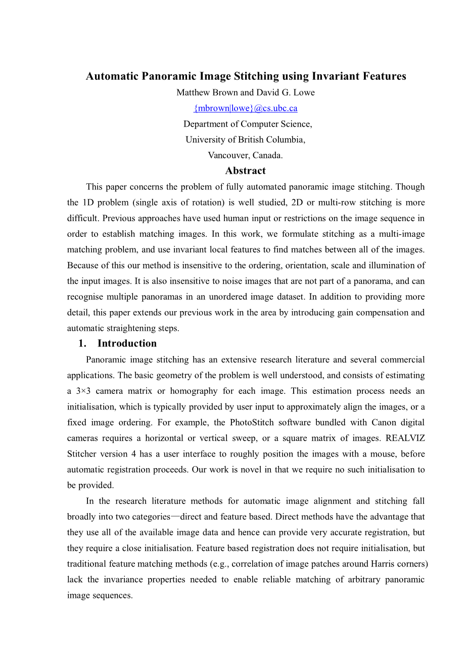 本文研究全自动全景图像的拼接问题,尽管一维问题(单一旋转轴)很好研究,但二维或多行拼接却比较困难。以前的方法使用人工输入或限制图像序列,以建立匹配的图像,在这篇文章中,我们假定拼接是一个多图像匹配问题,并使用不变的局部特征来找到所有图像的匹配特征。由于以上这些,该方法对输入图像的顺序、方向、尺度和亮度变化都不敏感;它也对不属于全景图一部分的噪声图像不敏感,并可以在一个无序的图像数据集中识别多个全景图。此外,为了提供更多有关的细节,本文通过引入增益补偿和自动校直步骤延伸了我们以前在该领域的工作。
