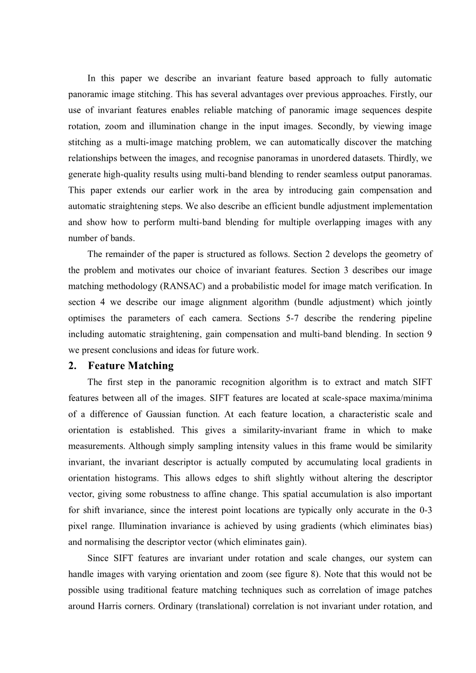 本文其余部分的结构如下。第二部分说明所研究问题的几何学和我们选择不变特征的原因。第三部分介绍了图像匹配方法(RANSAC)和验证图像匹配的概率模型。第四部分中,我们描述了图像对准算法(捆绑调整),即共同优化每个摄像头的参数。五到七部分描述了处理过程,包括自动校直、增益补偿和多波段融合。第九部分中,我们给出了结论和对未来工作的展望。