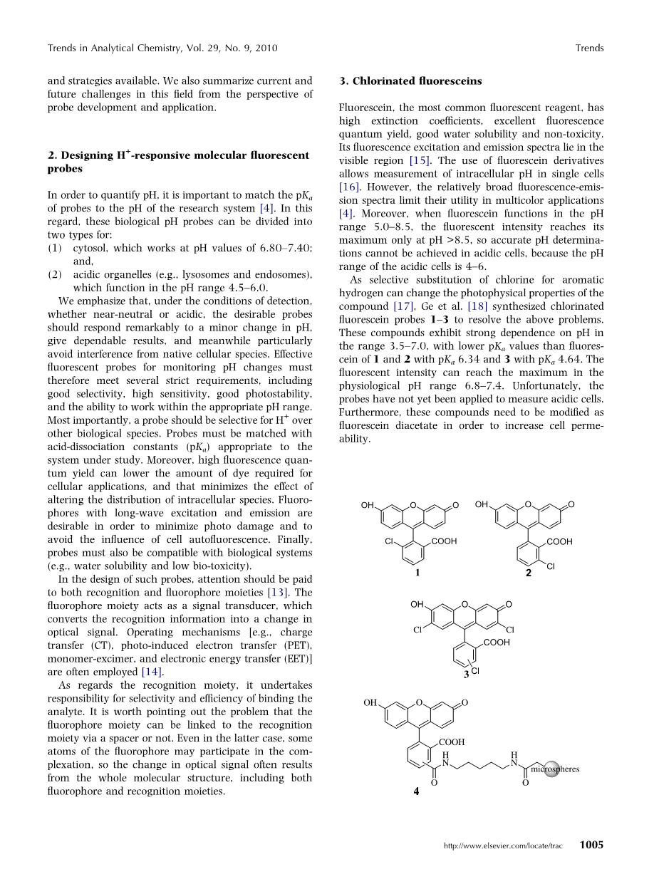 芳族氢的氯选择性取代可以改变化合物的光物理性质[17]。Ge等人 [18]合成的氯化荧光探针1 - 3以解决上述问题。这些化合物在pH范围3.5-7.0内表现出对pH值的强依赖性,并且1和2的pKa6.34和3的pKa4.64低于其相应荧光素的。在生理pH范围6.8-7.4荧光强度最大可以达到。不幸的是,这种探针尚未应用于测量酸性细胞。此外,为了增加细胞渗透能力这些化合物需要被修改为荧光素二乙酸酯。