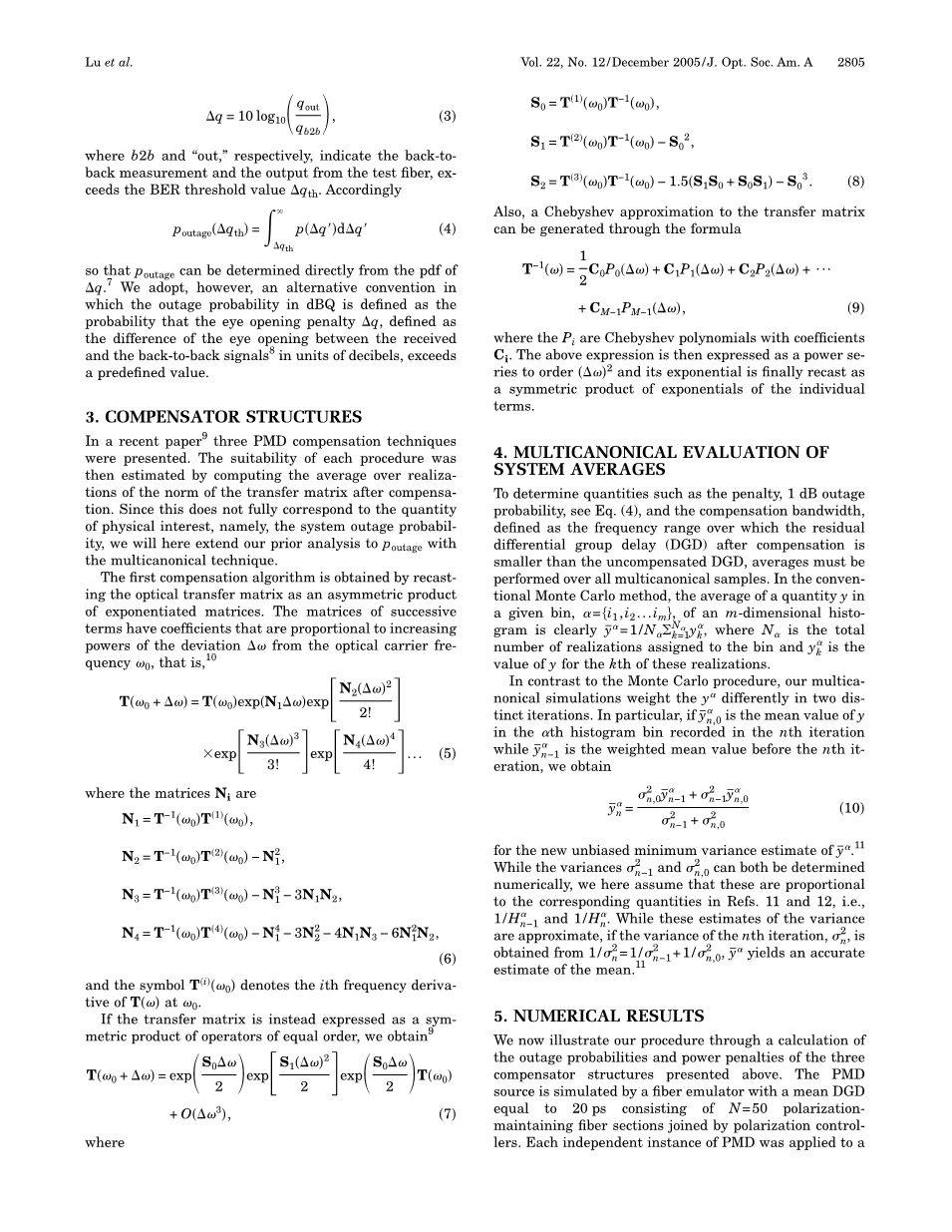 在最近的paper93 PMD补偿技术已提交。每道工序的适宜性然后通过计算平均值的实现估计的补偿后的传输矩阵的常态。由于该不完全对应于量物理兴趣的,即,该系统中断概率我们将在这里扩展我们之前的分析结果与poutage在多正技术。第一补偿算法由重铸得到光学传递矩阵作为不对称产物的幂矩阵。连续矩阵