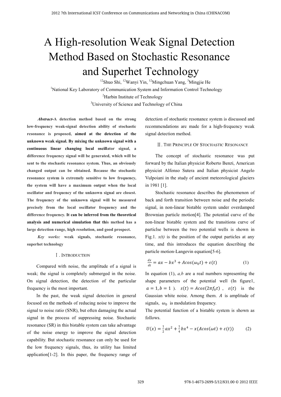 在过去,一般的弱信号检测集中在降低噪声的方法,以提高信噪比(信噪比),但在抑制噪声的过程中,往往会破坏实际的信号。在这种双稳态系统的随机共振(简),可以利用的噪声能量,以提高信号检测能力。但是随机共振只能用于低频信号,因此,它的实用程序有有限的应用[ 1 ]。在本文中,频率范围对随机共振系统的检测方法进行了讨论,并提出了一种高频微弱信号检测方法。