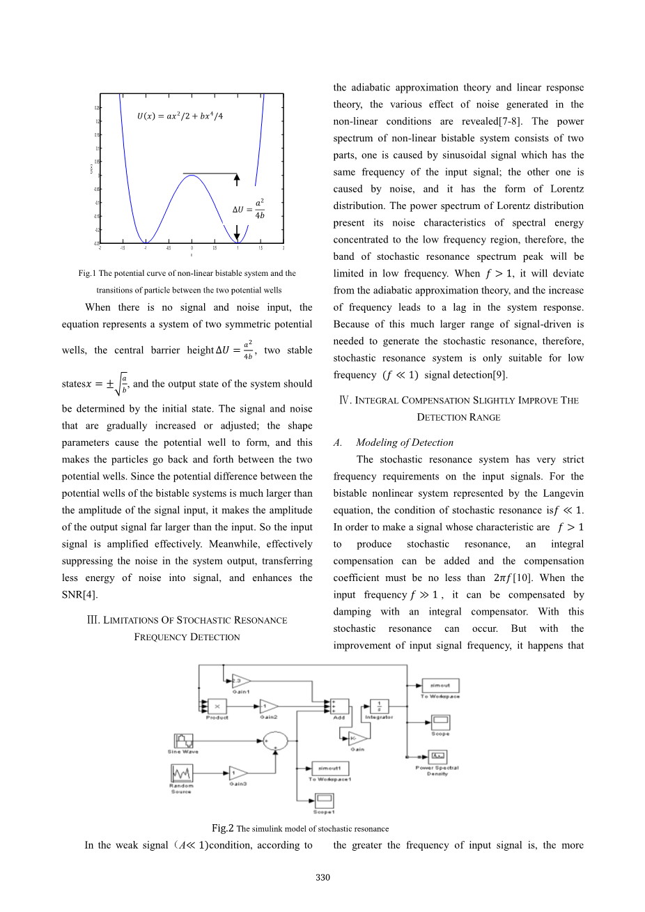 随机共振系统的建模与输入信号的频率要求非常严格。对于双稳态非线性系统的朗之万方程表示,随机共振的条件f≪1。为了使信号的特征是fgt;1产生随机共振,可以增加积分补偿,补偿系数不小于 [ 10 ]。当输入频率f≫1,它可以用一个积分补偿器阻尼补偿。有了这个随机共振可能发生。
