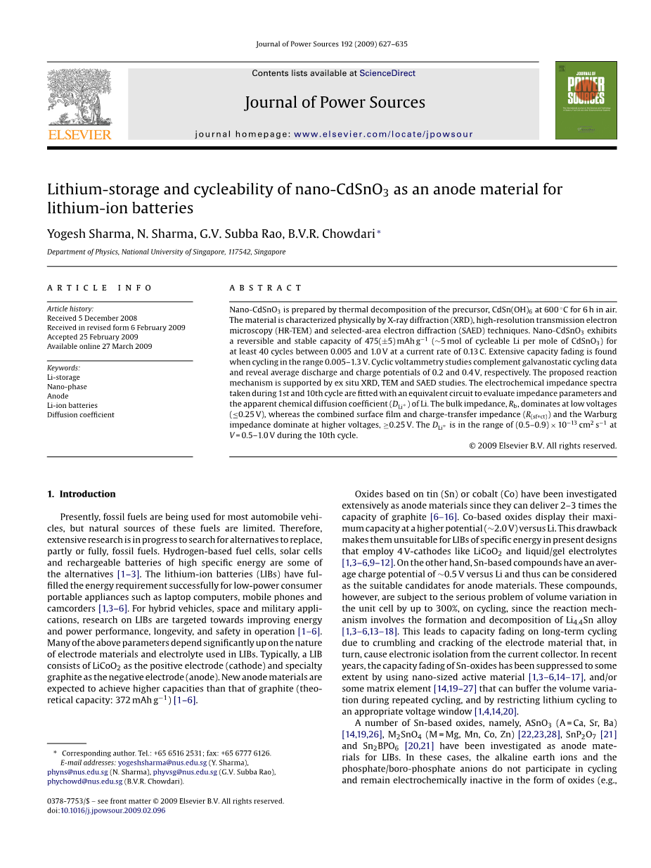 CdSnO3是由两种对锂具有电化学活性并被广泛作为气敏性材料研究的两种阳离子构成的化合物[30,31]。除了锡合金消耗的4.4 mol Li之外,镉可以消耗3 mol Li形成Li3Cd合金,从而提高可逆容量。其结果是,CdSnO3的理论可逆容量高达711 mAh g-1。上述事实为评估其作为锂离子电池负极材料的适用性提供了动力。正如前面提到的,立方结构的Zn2SnO4有利于锂循环[28]。因此,在目前的工作中,通过热分解制备出立方结构的纳米CdSnO3,并通过各种物理技术测定其特性。锂循环特性研究表明每1 mol CdSnO3中有5 mol锂能够以475(plusmn;5) mAh g-1的容量稳定循环40次以上。通过循环伏安法,阻抗谱,X射线衍射(XRD)和透射电子显微镜测试所得到的多种数据都在本文中进行了报道和讨论。