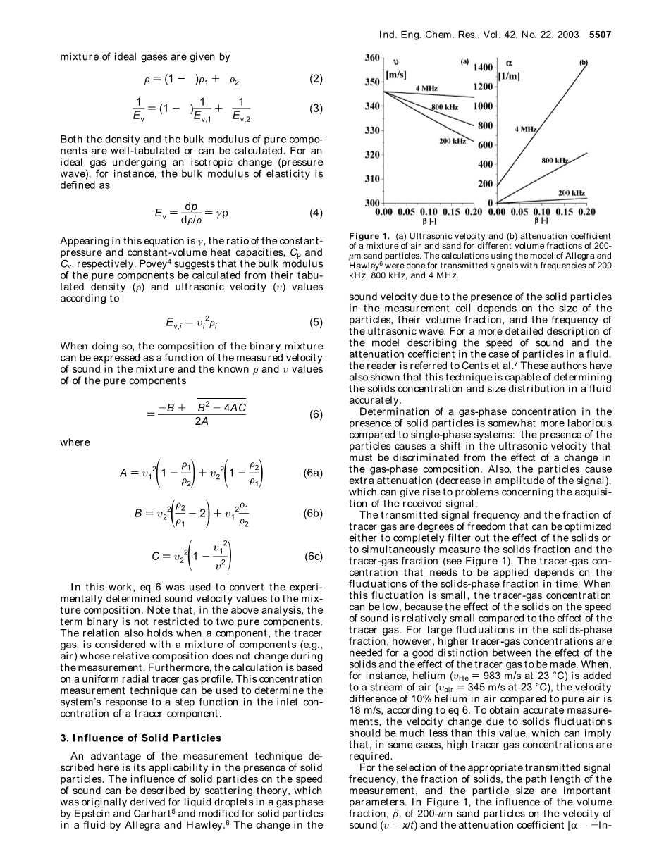 这里介绍的测量技术的一个优点是在固体颗粒存在情况下的适用性。固体颗粒的影响可以根据散射理论来解释,声音速率的变化取决于在测量单元中固体颗粒的大小,它们的浓度和超声波的频率。这些作者还表明,这种技术是能够在流体中准确的确定固体的浓度和粒度。固体颗粒物中气相浓度的测定相对于单相系统有些更复杂。颗粒的存在造成的超声波速度的偏移是必须在气相系统里被忽略的。当然,颗粒的存在会造成额外的衰减,减少信号的幅度,它可以引起关于获得接收信号的问题。对于所选择的适当的传输的信号频率,固体的馏分,测量的路径长度和颗粒尺寸都是重要参数。