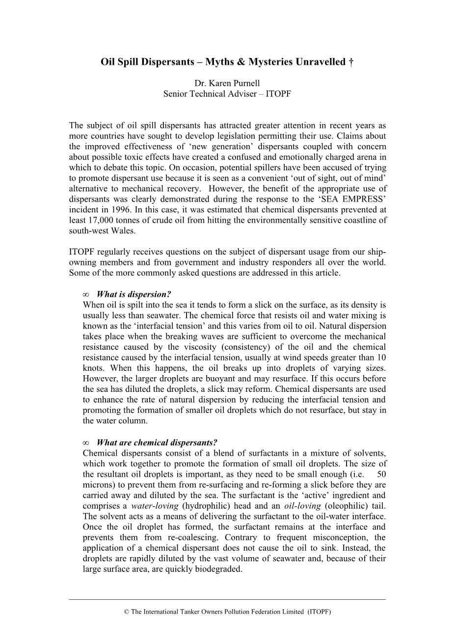 分散剂是这样的一种选择。通过破坏浮油的油膜,可以减轻相关溢油涂料和令人窒息的影响。有明确的科学证据表明,在某些情况下,他们可以减少生物损伤。不过,分散剂不是万能的。本报告的目的是提供一个平衡的关于何时使用它们,特别是当它是适当的时候参考环境关注。