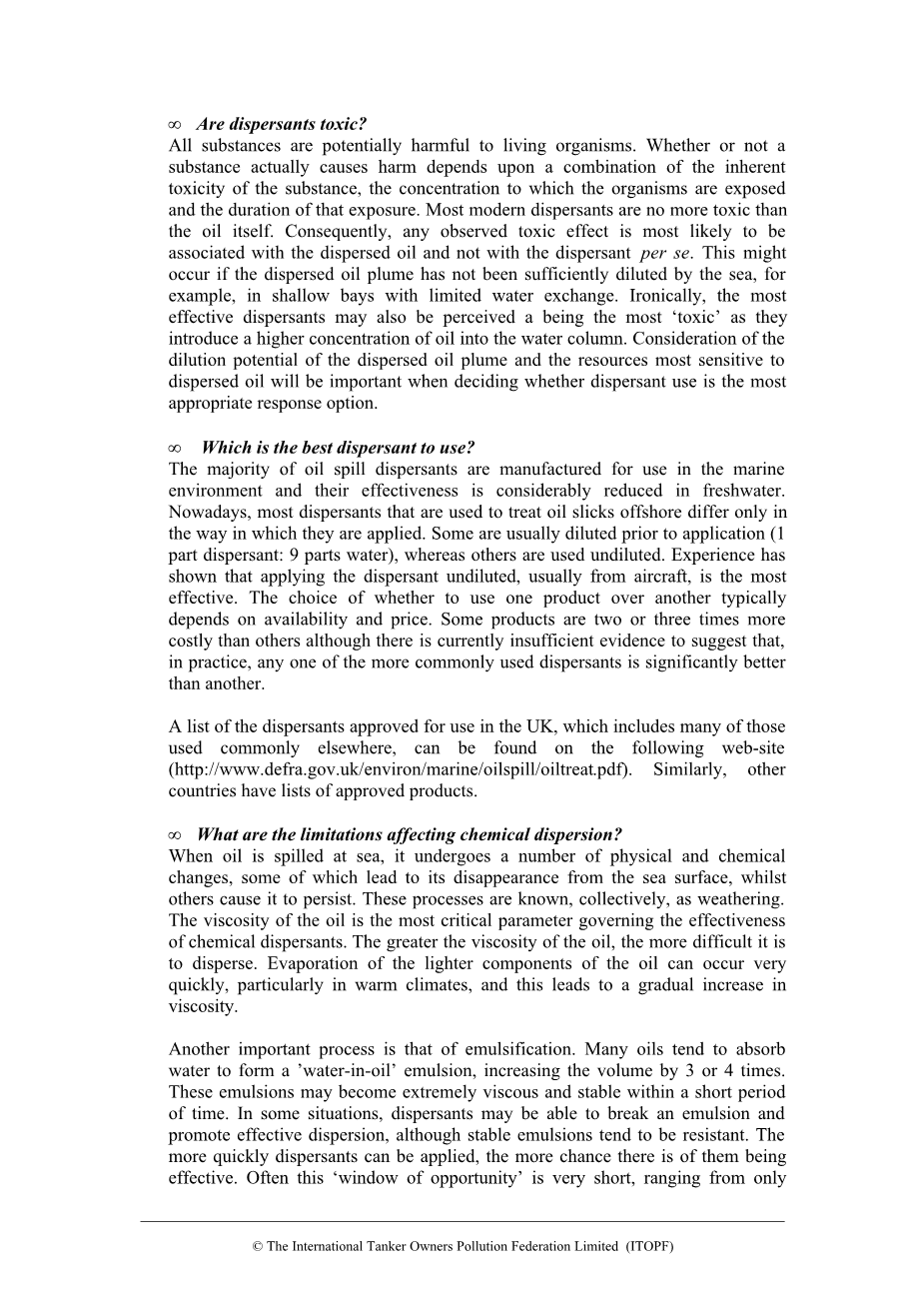 最有可能影响化学分散剂是否是一个有效的影响因素,并不是那些与分散剂的选择或剂量率相关联的。相反,它将会出现这些问题,例如溢油的类型、敏感资源的风险性、优先保护的问题,以及是否某一个国家对使用分散剂有明确的政策和详细的计划。当设施或船舶溢出的石油和使用分散剂,事先未经同意或违反国家的政策方面法规,可能导致意见不合甚至罚款。然而,国际油轮船东防污染联盟是继续与政府和行业一起合作,来解决一些他们对分散剂的使用政策审议过程中出现的问题。我们希望有一个公正的和有教育背景人参加的辩论,将确保化学分散剂得到一个“公平的听证会”。