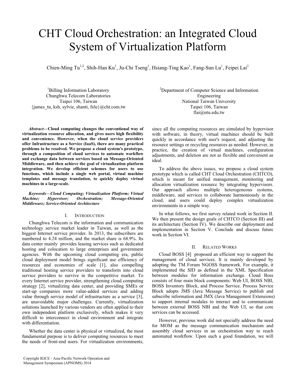 为了解决上述问题,我们提出了一个被称为CHT云编排(CHTCO)的云计算系统原型,这是为统一管理,通过监督和整合虚拟机管理程序来分配虚拟化资源。我们的方法允许有多个不同的系统,中间件和服务设施,以在云和谐操作,并且用户可以以简单的方式部署复杂的虚拟化环境。
