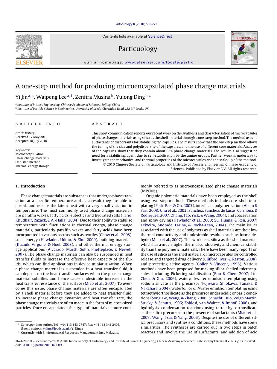 关键词:微胶囊化,相变材料,一步法,储热。