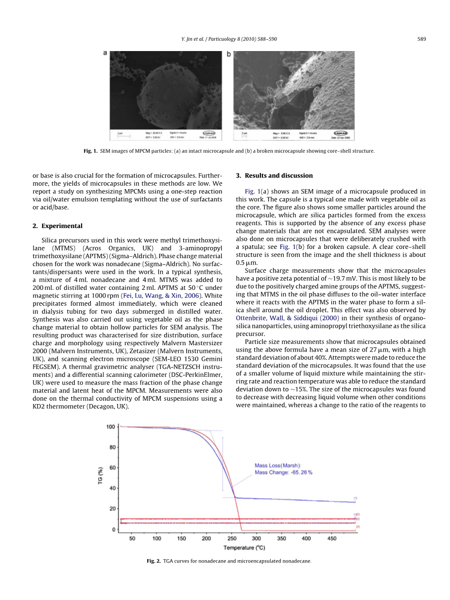 在这项工作中使用的硅前体的三甲氧基硅烷(MTMS)(在有机物、英国)和3-氨丙基三甲氧基硅烷(APTMS)(西格马–奥德里奇)。相变材料的选择工作是十九烷(sum;–奥德里奇)。没有表面活性剂/分散剂应用于工作。在典型的合成,一个4毫升和4毫升的MTMS十九混合物中加入蒸馏水200 ml含2毫升氨丙基三甲氧基硅烷 50◦C在磁力搅拌下在1000转(飞卢,王,和鑫,2006)。在蒸馏水中浸泡2天的透析管中形成的白色沉淀物,以植物油为相变材料,用植物油作扫描电镜分析。该产品的特点是粒度分布、表面电荷,分别用马尔文颗粒度分析仪2000形态(马尔文仪器、英国)、激光粒度仪(马尔文仪器,英国),扫描电子显微镜( 1530)。热重分析仪和差示扫描量热仪(珀金埃尔默,英国)是用来测量相位变化的质量分数材料和相变潜热。测量也完成了对导热相变悬浮液使用KD2温度计(十,英国)。