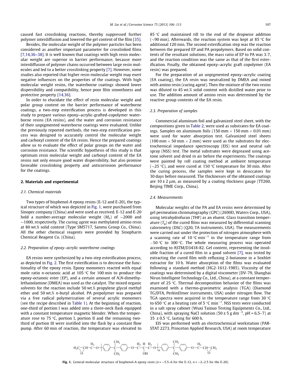 为了阐明树脂分子量和极性基团含量对水性涂料防护性能的影响,本文研发了一个两步酯化工艺制备不同的环氧-丙烯酸接枝共聚物水性树脂(EA树脂),以及对无颜料的水性涂料的耐水性和耐腐蚀性进行了评价。与之前报道的方法不同,这个两步酯化工艺准确地控制了EA树脂的分子量和羧基含量。因此,所制备的涂层使我们能够评估极性基团对耐水性和耐腐蚀性的影响。这项研究的科学假设是EA树脂的最佳分子量和羧基含量不仅能确保良好的水分散性,而且还能保证良好的交联性能和涂层的防腐性能。