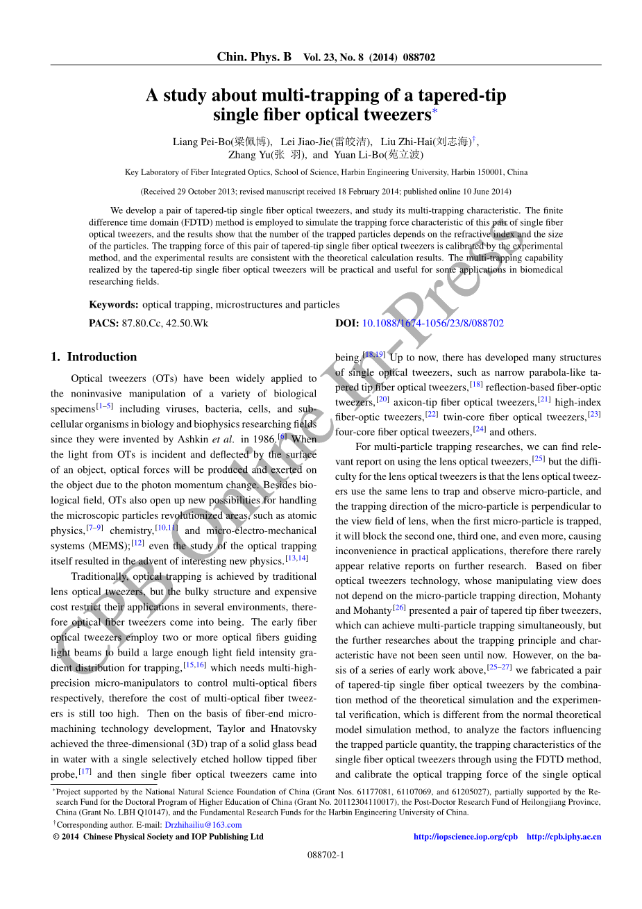 关于多粒子捕获的研究,我们找到一篇使用传统透镜光镊的相关报告,这篇报告中他们发现的问题是:当使用同一批透镜来捕获和观察多粒子,且微粒子的捕获方向是垂直于透镜的视场:当第一个微粒子被捕获后,它会阻碍第二个,第三个甚至更多粒子的捕获,影响了传统光镊的实际应用;因此,有关于进一步研究的相关报告鲜少出现。光纤光镊技术,其操作视野并不依靠于微粒子的捕获方向,Mohanty 和Mohanty提出一对锥形尖端的光纤光镊,可用来实现多粒子的同时捕获,但是有关于捕获原理和性质的进一步研究目前为止并未出现。然而,根据一系列的前人的工作和研究结果,我们综合了理论计算和实验计算,制造了一对锥形尖端的单光纤光镊,这些理论和实验都与常用的理论模型仿真不同。为了分析影响单光纤光镊捕获粒子的数量和捕获特性的因素,我们使用了时域有限差分方法,并使用一对校正了的单光纤光镊校正了单光纤光镊的光捕获力。这些进一步的研究使得在实际的研究领域,使用单光纤光镊是可行的。