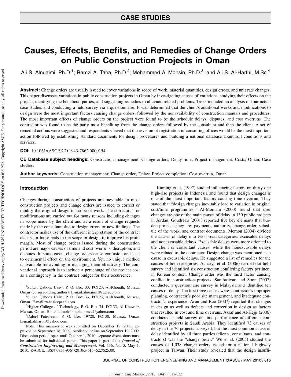 CE数据库主题词:施工管理;变更指令; 延迟时间; 项目管理;成本; 阿曼; 案件研究。