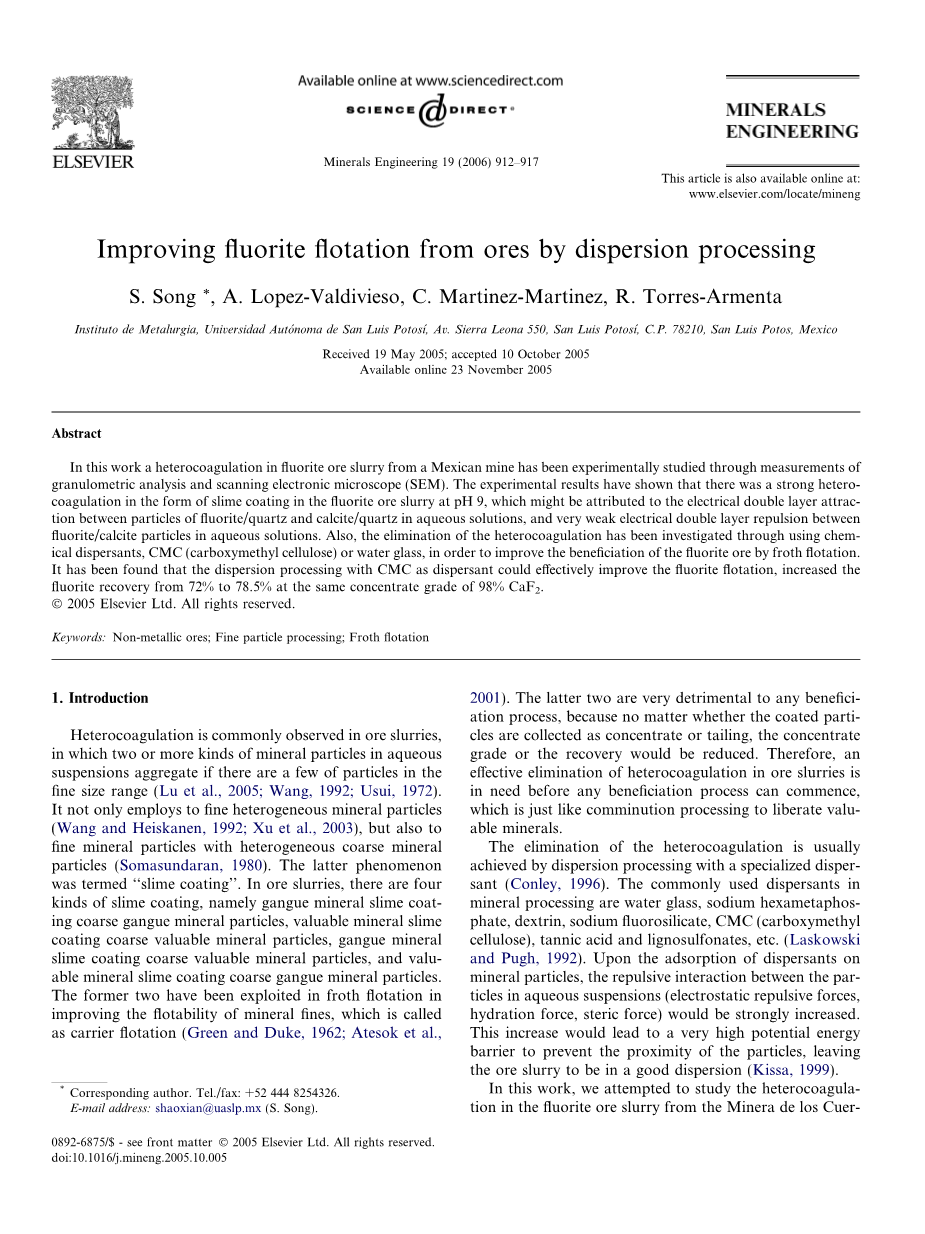 摘要:本文采用粒度分析和扫描电子显微镜的测量方法对墨西哥某氟石矿浆中的异性凝聚进行了试验研究。试验研究结果表明,在pH为9.0时,氟石矿浆中有强烈的异性凝聚,以矿泥罩盖的形式存在。这可能是由于悬浮液中氟石或者石英颗粒和方解石或者石英颗粒之间的的双电层引力,和很弱的氟石或者方解石颗粒之间的双电层斥力导致的。为了强化氟石在浮选中的可选性,采用了分散剂(CMC或水玻璃)对异性凝聚的消除进行了深入的研究。试验结果表明,采用CMC作为分散剂进行分散处理能够有效的提高氟石矿的可选性,氟石的回收率从72%提高至78.5%,同时CaF2品位提升为98%。