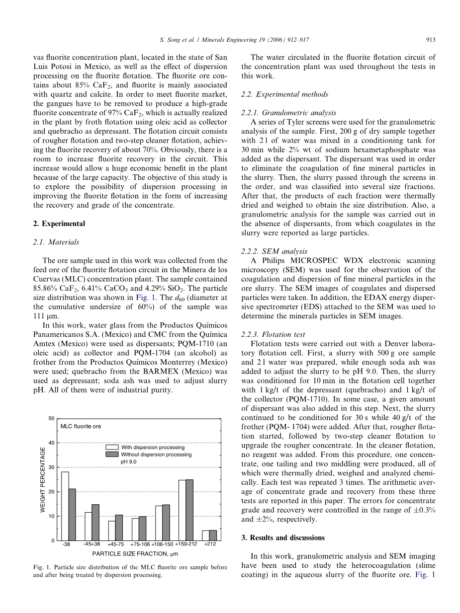 本次试验中,我们试图探究氟石矿浆(来源于墨西哥圣路易斯波托西州的某选厂)中的杂聚物,同时在分散处理对氟石浮选的影响这一方向也进行了研究。氟石矿中含量为85%,主要与石英和方解石共生。为了满足氟石市场需求,必须通过分离石英的方法来生产CaF2为97%的高品位氟石精矿。这一要求在选厂中已经实现,该厂以油酸为捕收剂,栲胶为分散剂进行泡沫浮选。该浮选回路包括一段粗选和两段精选,氟石回收率能够达到70%。很明显,浮选回路中氟石回收率还有进一步增长的余地。由于该厂处理能力非常大,如果改善工艺,使回收率进一步提高,则会使该厂获得巨大的经济利益。本次研究旨在探究分散处理在氟石浮选过程中,以提高回收率和精矿品位的形式强化氟石浮选的可能性。