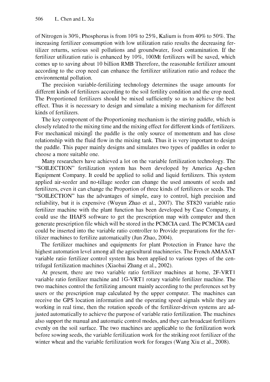 农业是我国经济的基础,但农业的粗放型方式已经不再能适应现代农业发展的要求。因此,精准农业的发展已成为必然趋势。肥料,作为农业生产中的一种材料,可以提高作物产量。但长期以来,化肥施用的突出问题是不合逻辑的施肥比例和高投入而利用率低,特别是磷肥的投入,造成养分投入不均衡和化肥投入成本增加。从1978到1995,全国化肥消费量增加了97%,但粮食产量只增加了36%,产量增加了1%,而化肥施用量增加了近3%。平均肥料利用率比发达国家低10%以上。利用率对应的氮30%、磷10%~25%,钾含量从40%到50%。化肥消费量的增加与利用率低直接导致肥料回报的减少,严重的土壤污染和地下水污染,食品的污染增加。如果肥料利用率提高10%,100mT肥料将被保存,从而达到节省约100亿元人民币,因此,根据作物的需要进行合理的施肥可以提高肥料的利用率,减少环境污染。施肥技术的精度决定了不同肥料的使用量,根据土壤肥力状况和作物需要量。均匀的肥料应充分混合,以达到最佳的效果。因此,有必要设计和模拟不同种类的肥料的混合机制。配料机构的关键组成部分是搅拌桨,这与各种肥料的搅拌时间和搅拌效果密切相关。对于机械搅拌桨,桨是唯一的动力来源,并与搅拌槽内的流体流动有着密切的关系。因此,设计桨是非常重要的。本文为了人们可以选择更合适的桨,所以主要设计和仿真两种桨。许多研究人员在变量施肥技术方面取得了很大的成就。“soilection”施肥系统已由美国银辰设备公司开发。它可以应用于固体和液体肥料。该系统运用空气播种机和免耕播种机可以改变使用大量的种子和肥料,甚至可以改变三种肥料或种子的比例。“soilection”简单、容易控制、精度高、可靠性好,但它极其昂贵(Wuyun Zhao et al.,2007)。在ST820可变比率肥料机与植物功能已经由Case公司开发,它可以使用的IHAFS软件获得处方图计,然后生成处方文件,该文件将被存储在PCMCIA卡。PCMCIA卡可以插入变速控制器提供的施肥机施肥自动准备(Jun Zhao,2004)。肥料机械设备在法国植物保护有所有的农业机械中处于最高的自动化水平。法国amasat变肥配比控制系统已被应用于各种类型的离心式施肥机(Xiaohui Zhang et al.,2002)。目前,在国内有两种变量施肥机,2f-vrt1变率施肥机和1g-vrt1旋转变量施肥机。双机控制施肥量主要是根据用户设定的偏好或由上位机计算的处方图。当他们工作的时候,机器可以接收到定位信息和运行速度信号,然后自动调节系统的旋转速度,以达到可变比例施肥的目的。该机器还支持手动和自动控制模式,并且它们可以在土壤表面均匀地广播肥料。两机适用于施肥工作之前播种、变量施肥对冬小麦返青肥和变量施肥对牧草(Wang Xiu et al.,2008)。