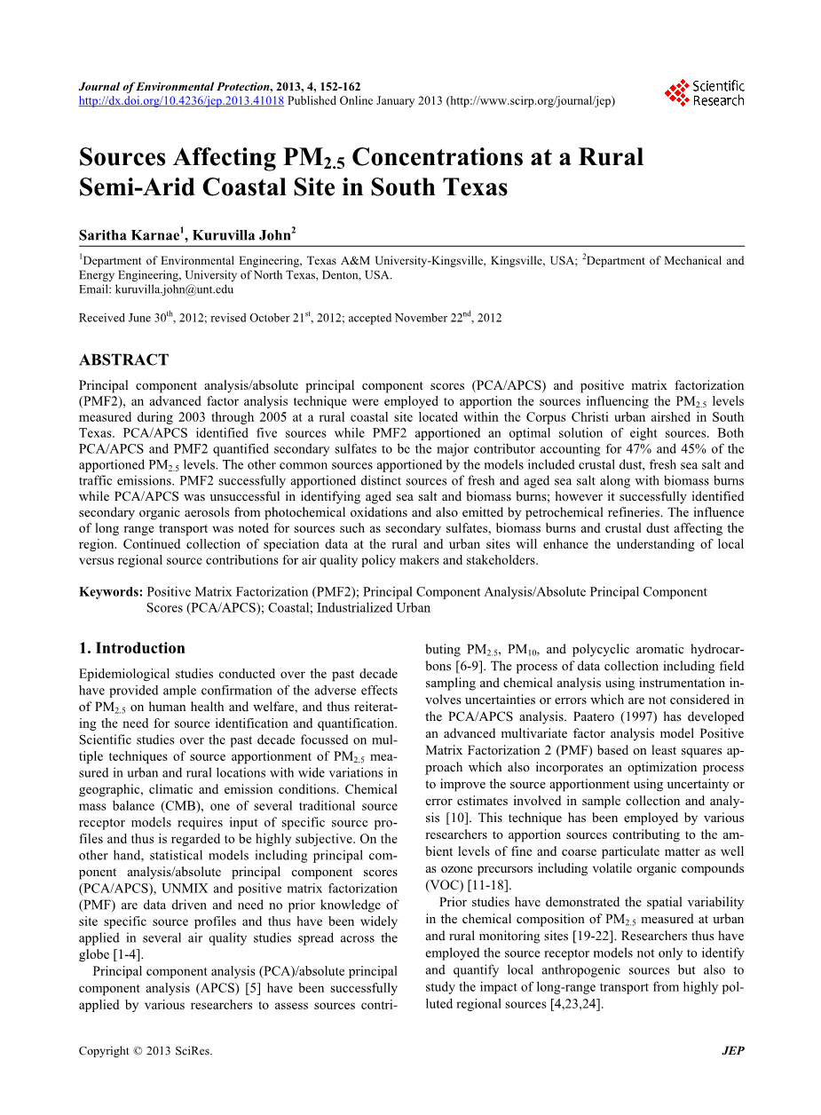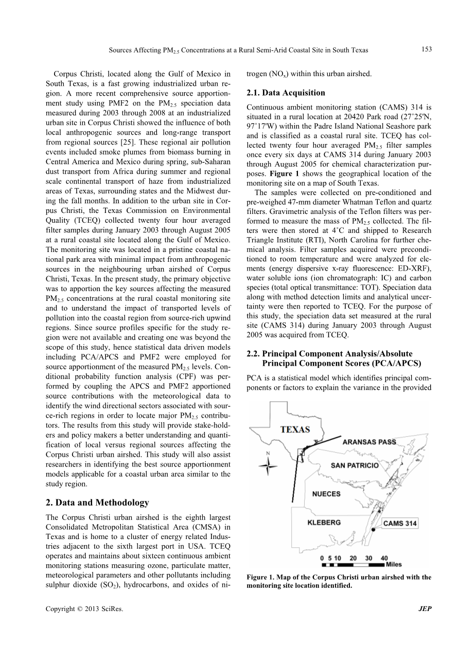 在科珀斯克里斯蒂市区,得克萨斯州环境质量委员会(TCEQ)在2003年1月到2005年8月期间收集每24小时的平均滤膜样品,通过墨西哥湾位于沿海农村的一个站点。该监测点位于得克萨斯州邻近的城市气域影响最小的质朴的沿海国家公园区。在本研究中,主要目的是分离在影响沿海农村监测点测得的PM 2.5浓度的主要来源,了解污染从丰富的来源源上风区到沿海地区的运输。由于本研究相关的区域源配置文件中没有提供且去创造一个超出了本研究的范畴,因此统计数据驱动的模型包括PCA/ APCS和PMF2被用于测量PM2.5级的源解析。