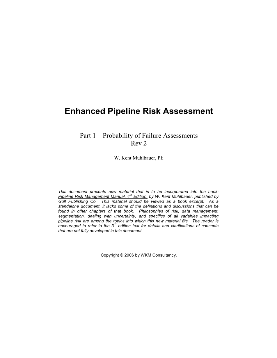 这个文献提出的新材料将被纳入由W.肯特.米尔鲍尔在海湾出版公司发表的管道风险管理手册(第4版)。这种材料应该被看作是一本书的摘录。作为一个独立文献,它缺乏某些定义和讨论,可以在管道风险管理手册那本书的其他章节中发现。风险哲学、数据管理、分割、处理不确定性、以及所有变量的具体影响,管道风险成为这种新材料适合的议题。读者被鼓励去参考在第三版本中没有充分发展概念的细节和说明。