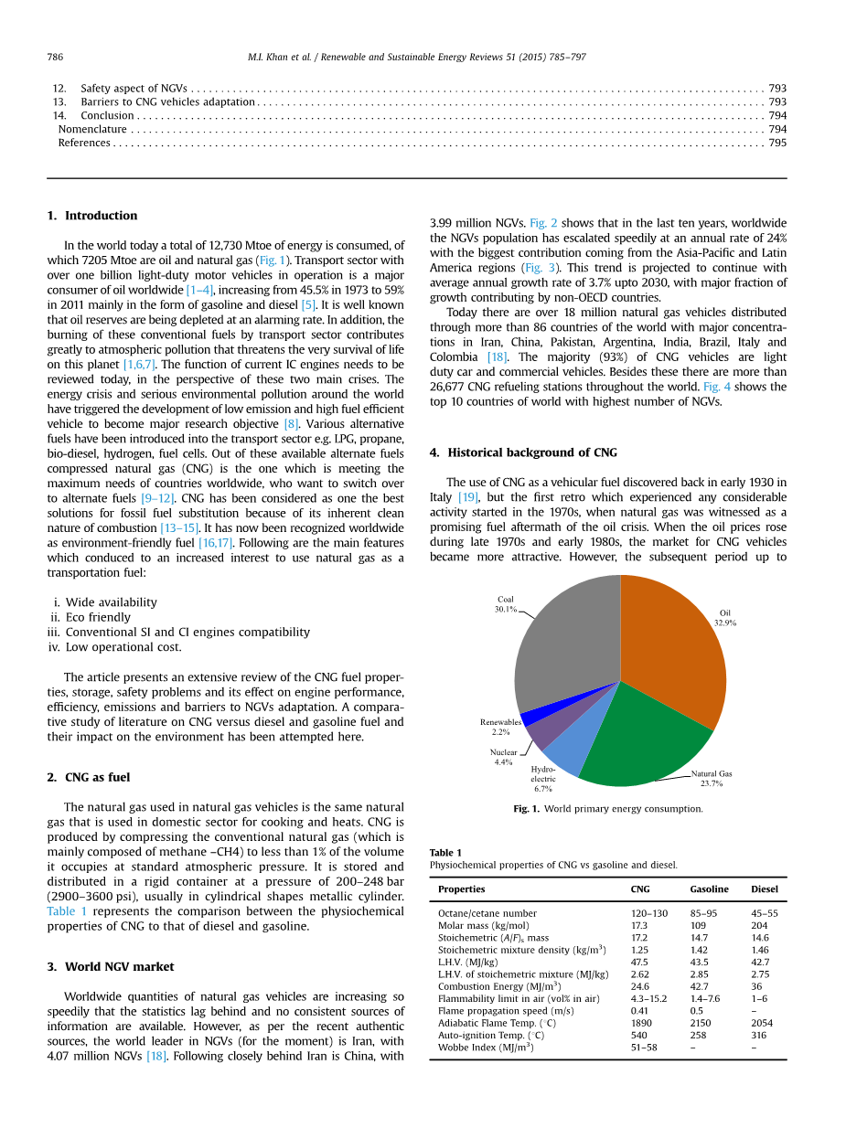 当今世界,有12730M的能量被消耗,其中7205M是石油和天然气 (图 1)。交通运输部有超过 10 亿的轻型机动车正在运行,是主要的石油消费者[1-4],而且石油需求呈上升趋势,从 1973 年的45.5%增至 2011 年的59%,其消耗形式主要是汽油和柴油。众所周知,现今石油储量正在以惊人的速度枯竭。此外,这些用于运输的传统燃料燃烧产生的气体造成了大气污染,威胁到了地球上生命的生存。人们也开始从这两方面的角度重新审查IC 引擎。能源危机和环境污染严重,引发世界各地争相发展低排放和高燃油效率的汽车,并将其作为其主要的研究目标。各种各样的替代燃料已被用于运输部门,例如液化石油气,丙烷,生物柴油,氢气,燃料电池。在这些可替代燃料中,压缩天然气(CNG)是一种能最大程度满足想要使用替代燃料的国家的需求。CNG,由于其固有的燃烧清洁的 [13-15]的性质已被视为最好的一种化石燃料的替代品。现在,作为环境友好型燃料,它已得到全世界的认可,把天然气作为一种运输燃料,已经得到越来越多的关注,其原因如下: