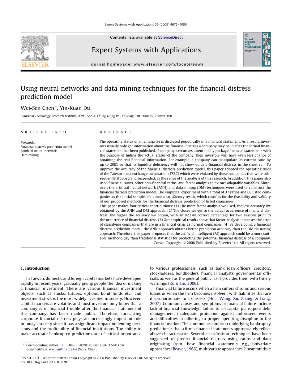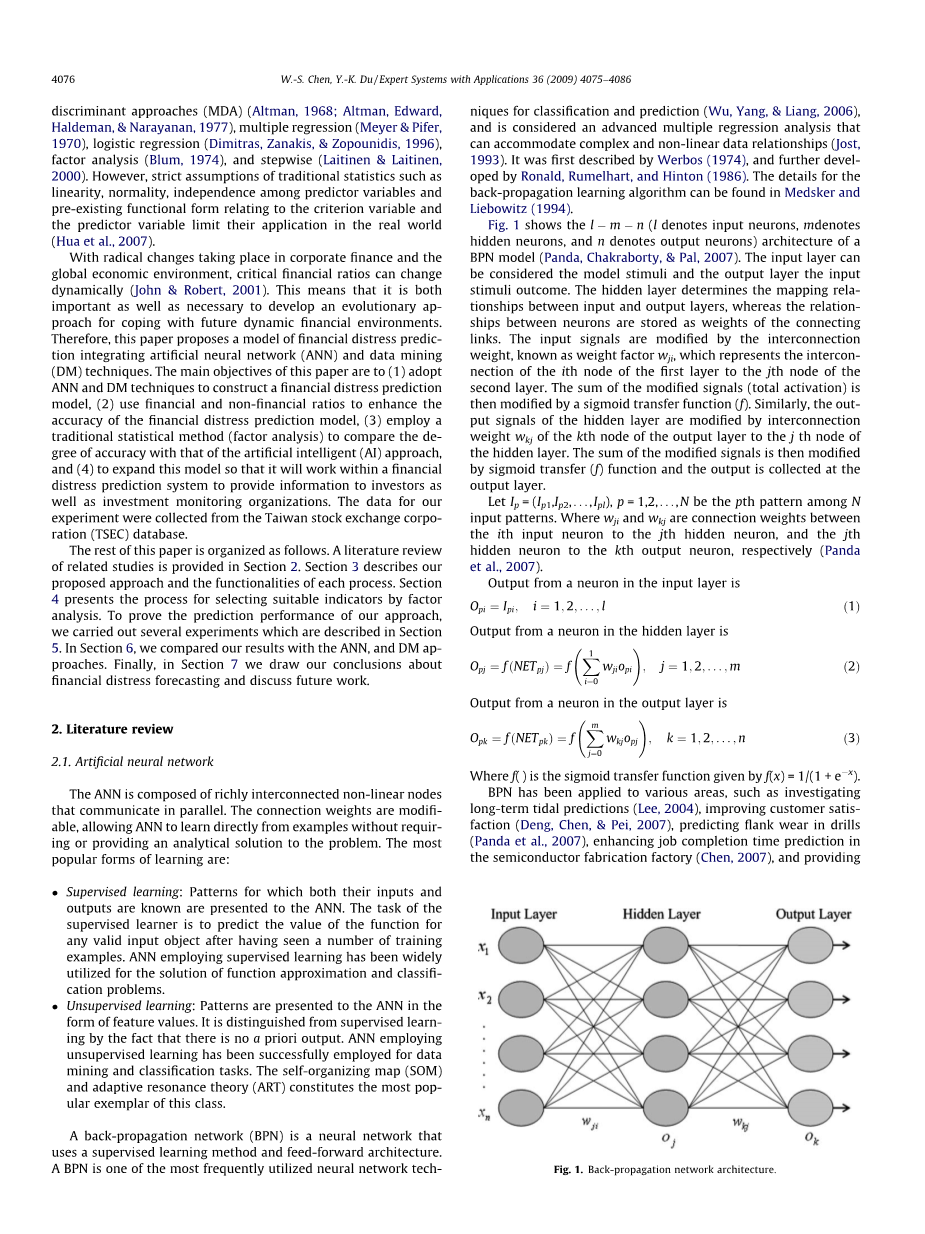 在台湾,国内外资本市场近几年来发展迅速,逐渐激发了人民进行金融投资的想法。金融投资的对象多种多样,如股票,期货,期权,债券型基金等。其中,股票投资是最受欢迎的。然而,资本市场是波动的,只有在公司公开披露财务报表之后,绝大多数投资者才会认识到公司正处于财务困境中。因此,预测公司的财务危机在当今社会发挥着越来越重要的作用,它对贷款决策和金融机构的盈利能力有着重要影响。对各类专业人士来说,如银行信贷员,债权人,股东,债券持有人,金融分析师,政府官员以及广大公众,准确预测公司破产的能力至关重要,因为这可以及时地向他们提供警告(Ko amp; Lin, 2006)。财务失败,通常是指企业遭受长期而又严重的损失或者资产不足以清偿其负债(Hua, Wang, Xu, Zhang, amp; Liang,2007)。财务失败的常见原因和具体表现包括:缺乏财务知识,未建立资本计划,债务管理不善,缺乏充分的应对突发事件的措施,难以坚持资本市场中的操作纪律。破产预测假设一个公司的财务报表恰当地反映了上述特点,到目前为止,已经有多种用于预测财务困境的分类方法,这些方法均采用源自财务报表的指标和数据。例如,单变量分析法(Beaver, 1966),多元方法,线性多元判别(MDA)(Altman, 1968; Altman, Edward,Haldeman, amp; Narayanan, 1977),多元回归法(Meyer amp; Pifer,1970),逻辑回归法(Dimitras, Zanakis, amp; Zopounidis, 1996),因子分析(Blum, 1974)和逐步回归(Laitinen amp; Laitinen,2000)。然而,传统的统计学方法要建立在严格的假设条件上,比如,各个变量之间要遵循线性分布和正态分布,各个变量之间是相互独立的。这使得其在现实中的运用受到了很大的限制(Hua et al., 2007).随着公司理财和全球经济环境翻天覆地的变化,一些主要的财务指标也产生了动态变化(John amp; Robert, 2001)。这意味着开发一种渐进的方法来应对未来动态的财务环境是重要且必要的。因此,本文在结合人工神经网络和数据挖掘技术的基础上,构建了全新的财务预警模型。本文的主要研究目的如下:(1)采用人工网络模型和数据挖掘技术来构建财务预警模型。(2)将财务指标和非财务指标相结合,从而提高财务预警模型的准确度。(3)比较传统的统计学方法(因子分析法)和人工智能方法的预测准确度(4)扩大模型的应用范围,使其能在财务预警体系中发挥良好的作用,既能为投资者提供信息也能为监管机构提供信息。本文实证研究所采用的数据来源于台湾证券交易所数据库。本文后续的内容安排如下:第二章是相关研究的文献综述,第三章介绍了本文采用的方法以及各个步骤的作用。第四章介绍了利用因子分析法选取合适的变量指标的过程。本文在第五章展开了多次实验,以证明方法的预测性能。在第六章,将利用本文的方法得到的结果分别与单独使用人工神经网络和数据挖掘技术方法所得到的结果进行比较。最后,对财务预警和未来的研究方向作出了总结。