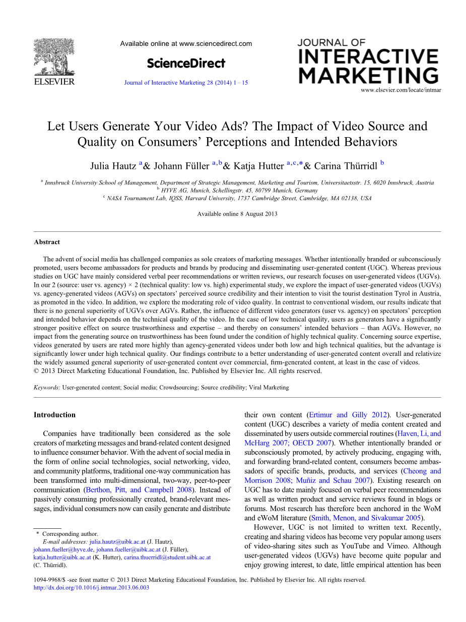 社交媒体的出现对企业成为营销信息的唯一创造者提出质疑。无论是对品牌和产品有意还是潜意识的推广。用户成为品牌和产品的生产和传播的生成内容(UGC)大使。而以前研究UGC主要考虑口头或书面评论同行的建议,我们的研究主要集中在用户生成的视频(UGVs)。在我们的2(来源:用户与代理)times;2(技术质量:低与高)的实验研究中,我们探讨影响用户生成的视频(UGVs )与代理生成的视频(AGVs)对观众的感知可信度和他们打算参观奥地利的旅游胜地蒂罗尔在视频中的推广。此外,我们还探讨了视频质量的调节作用。与传统观念相反,我们的结果表明,有没有通用的优势在AGVs无人地面车辆。相反,不同的视频发生器(用户与机构)对观众的看法的影响和预期的行为取决于视频的技术质量。在低技术质量的情况下,用户作为发电机有一个显著更积极的影响源的诚信和专业知识,从而比AGVs对消费者预期的行为。然而,没有在高技术质量条件下,发现了产生信任度的影响。关于专业知识的来源,由用户产生的视频被评为在低和高技术质量的视频更高的机构所产生的视频,但优势是在高技术质量的条件下明显降低。我们的研究结果有助于更好的理解用户生成内容的整体和相对化生成普遍认为用户生成的内容的一般优势,比如企业生成的视频内容在商业性上。copy;2013直销教育基金会,公司由Elsevier公司出版,保留所有权利。