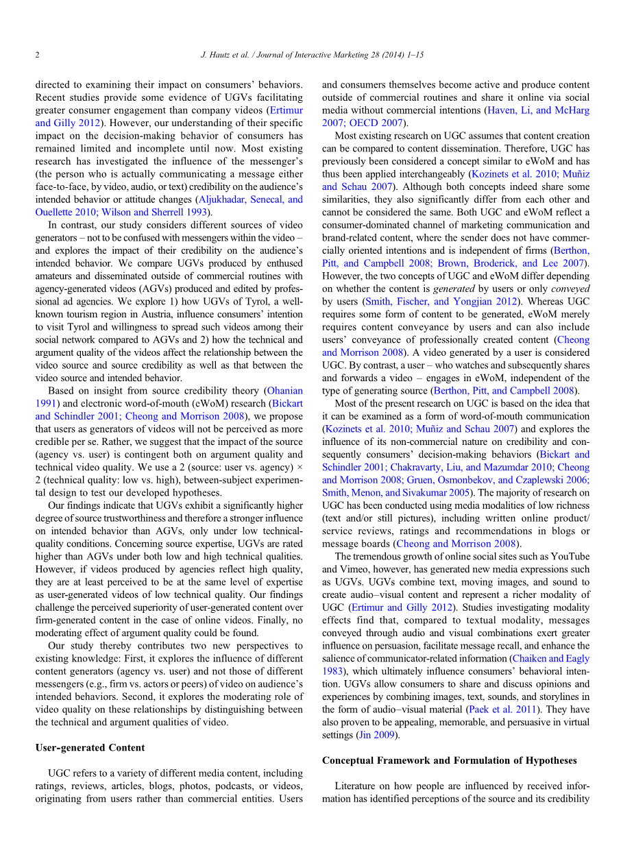 然而,用户原创内容不限于书面文本。最近,视频分享网站如YouTube和Vimeo。虽然用户生成的视频已经很受欢迎,享受越来越大的兴趣,迄今为止少有被关注。检查其对消费者的行为的影响。最近的研究试提供无人地面车辆的促进手段,一些证据证明有比公司更大的视频消费者的参与。但是我们自己具体的理解对消费者的决策行为的影响仍然有限和不完整。直到如今。大多数现有的研究调查了信使的影响(无论是面对面,通过视频,音频,或者书面的文本进行通信,预期的行为或态度都有变化。