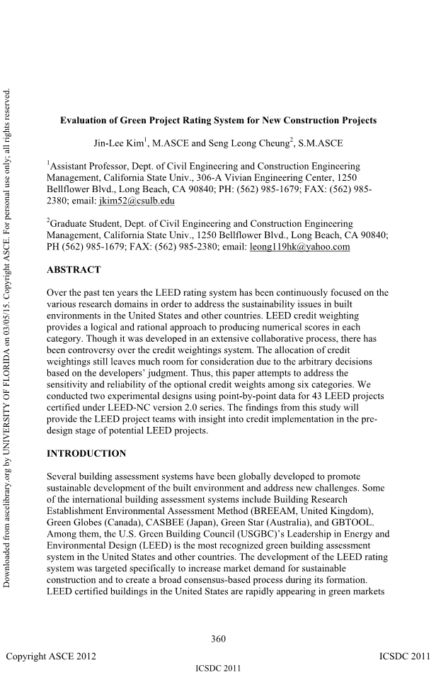说明:在过去十年里, 为了解决美国和其他国家在建筑环境方面的可持续发展问题,LEED(绿色能源与环境设计先锋奖)评级系统被不断用于各种研究领域。LEED信贷权提供了一个逻辑的和合理的方法来产生每个分类中的数值分数,尽管它是一个在广泛的协作过程中发展的,一直有争议的信用权重体系。根据开发者的判断,信贷分配权重由于武断的决定仍有很大的考虑空间。因此,本文试图解决信贷之间的权重灵敏度和可靠性的可选的六个类别。我们根据LEED-NC2.0版系列认证下的LEED43项目采用逐点数据法进行了两次实验设计。这项研究的结果为LEED项目团队提供了洞察在前期设计阶段潜在的LEED 项目。