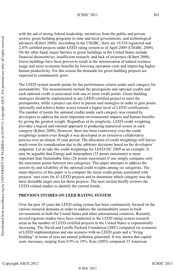 LEED体系指出每个类别下的可持续发展的性能标准。测量包括先决条件和可选的指标,每一个可选信贷与一个或多个指标相关。绿色建筑策略应该是每一个获得LEED认证的项目必须满足的先决条件,而一个项目可以选择追求说策略,以选择性获得积分,并朝着LEED认证的更高水平取得更好的成绩。每个类别下的可供选择的学分的数量由开发人员来解决最重要的环境影响和人类的利益,给予最大的重量。无论它是否简单,LEED信贷权重提供了在每个类别生产数值分数逻辑和理性的方法(Kibert 2008)。然而,尽管信贷权重系统在一个广泛的协作过程中开发近10年,它仍然存在争议。信贷分配的权重因为是基于开发商的武断决定仍有审议的空间。让我们以2009年LEED-NC信用权重作为一个例子,如果仅仅简单的比较两个类别之间的最高分来判断“能源和大气”(最高35分)比“选址的可持续性”(最高26分)重要的话,就不是很科学了。本文试图解决六大类中可选的信用权重的灵敏度和可靠性。本文的主要目的是比较项目的43个 LEED项目的单位成本相关联的平均学分并确定哪些类别是这些项目最可取的目标区域。下一节简要回顾了LEED相关的研究,以确定目前的趋势。